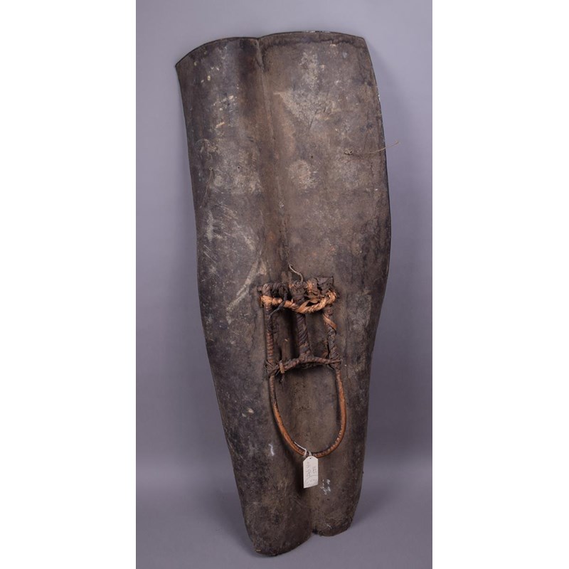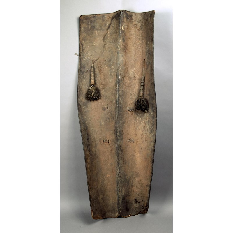 A Naga / Indonesian shield hide with two wooden and fibre pendants