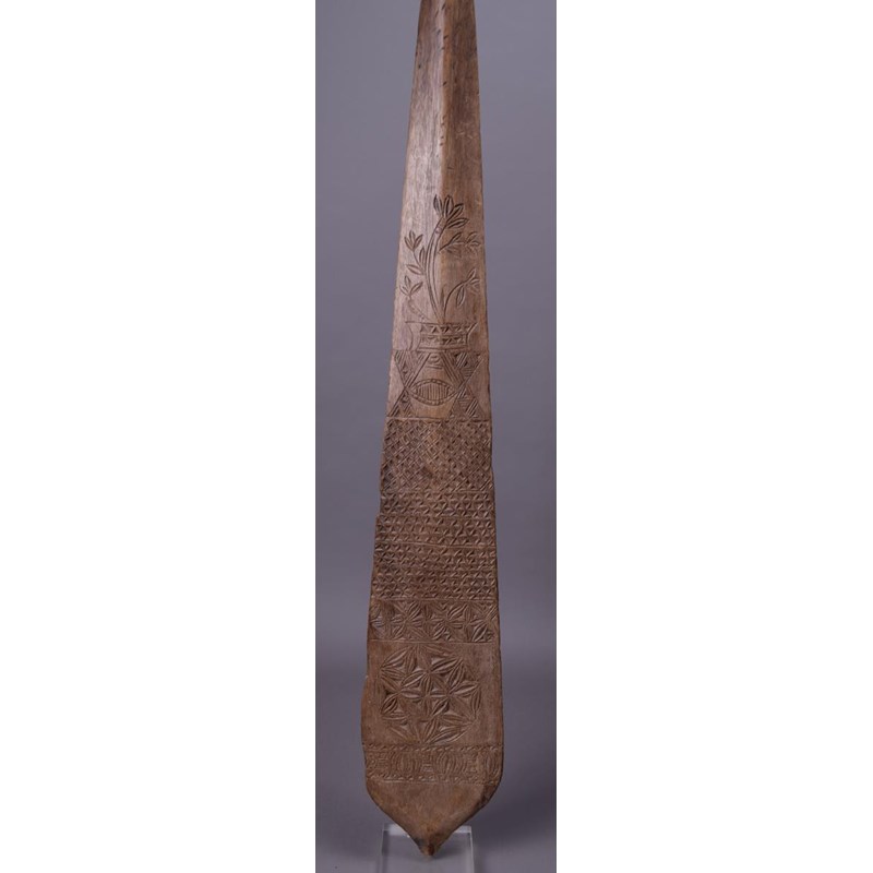 wood, with a pointed tip blade with carved geometric and foliage decoration, with a U shape terminal grip,