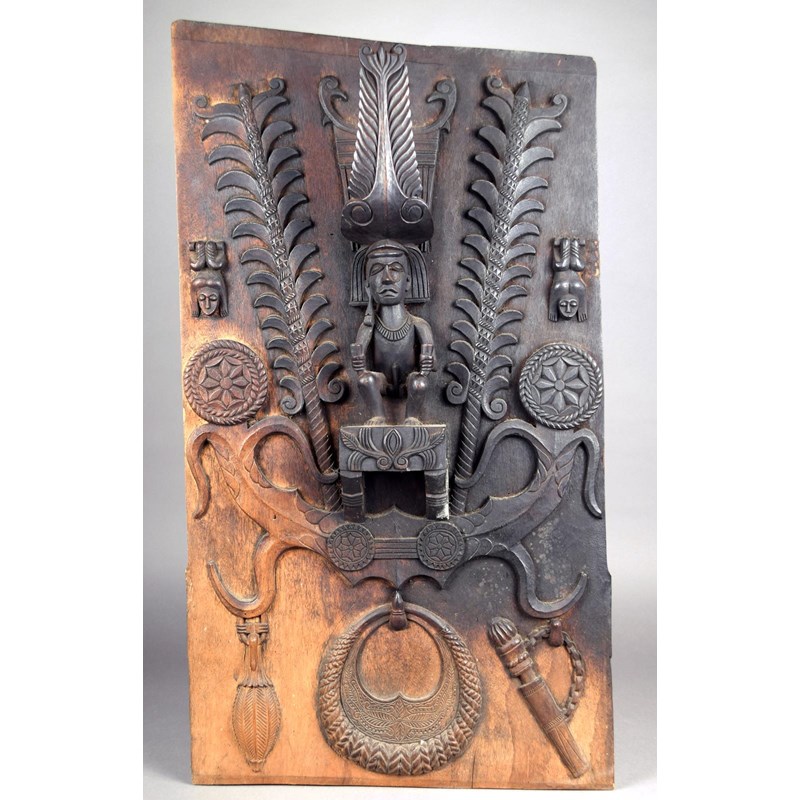 wood, carved in relief with a central seated male ancestor figure, leaf fronds, two hanging animals, a sword and a torque,