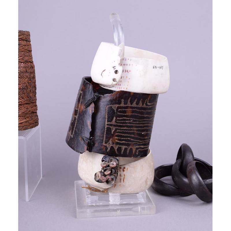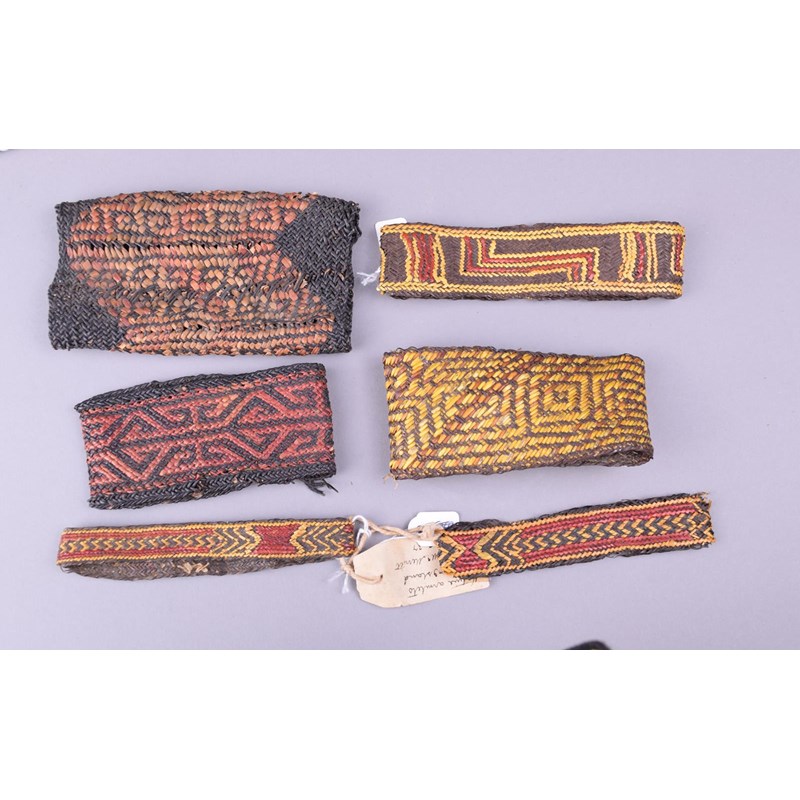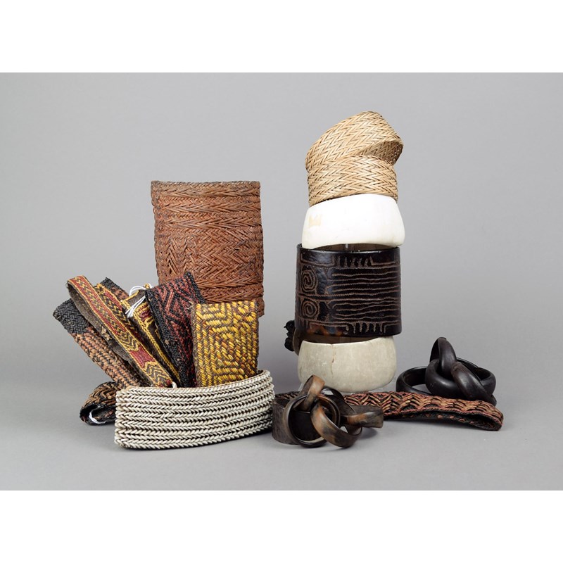 including two similar with red and yellow designs with a handwritten label Native armlets Buka Island Pres by Mr Merritt 1.2.37, a plain pair, with similar label Grass Armlets New Guinea Pres by Mr Lamb 8.7.35, and five others, a similar waist band, a woven shell armband, with label 38-1957, a Papua New Guinea turtleshell armband with incised decoration, 7cm wide, two links of turtleshell currency, and two Papua New Guinea shell currency bands, one inscribed 53-1957. (16)