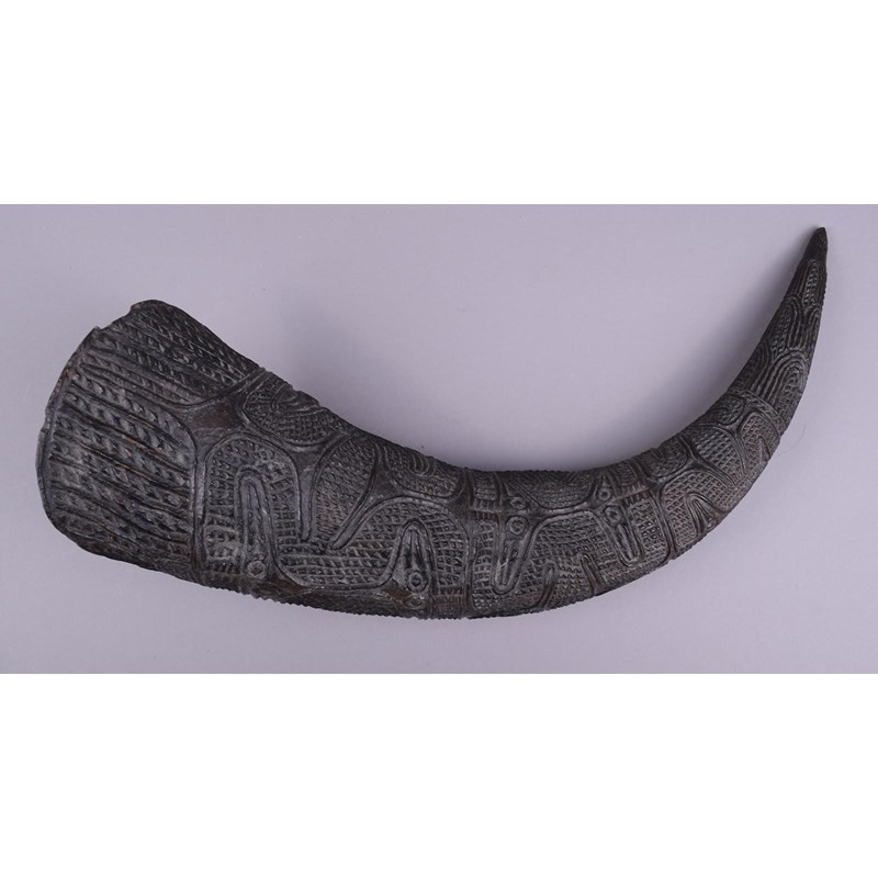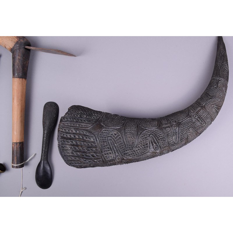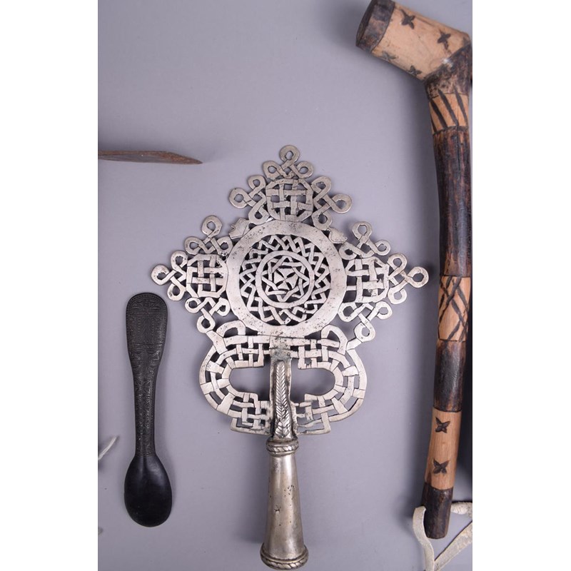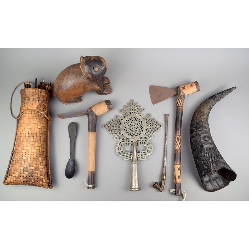 an Ethiopian processional cross, two axes, a Cameroon iron and brass pipe, a Somali spoon, a carved wood leopard and a quiver of arrows. (39)