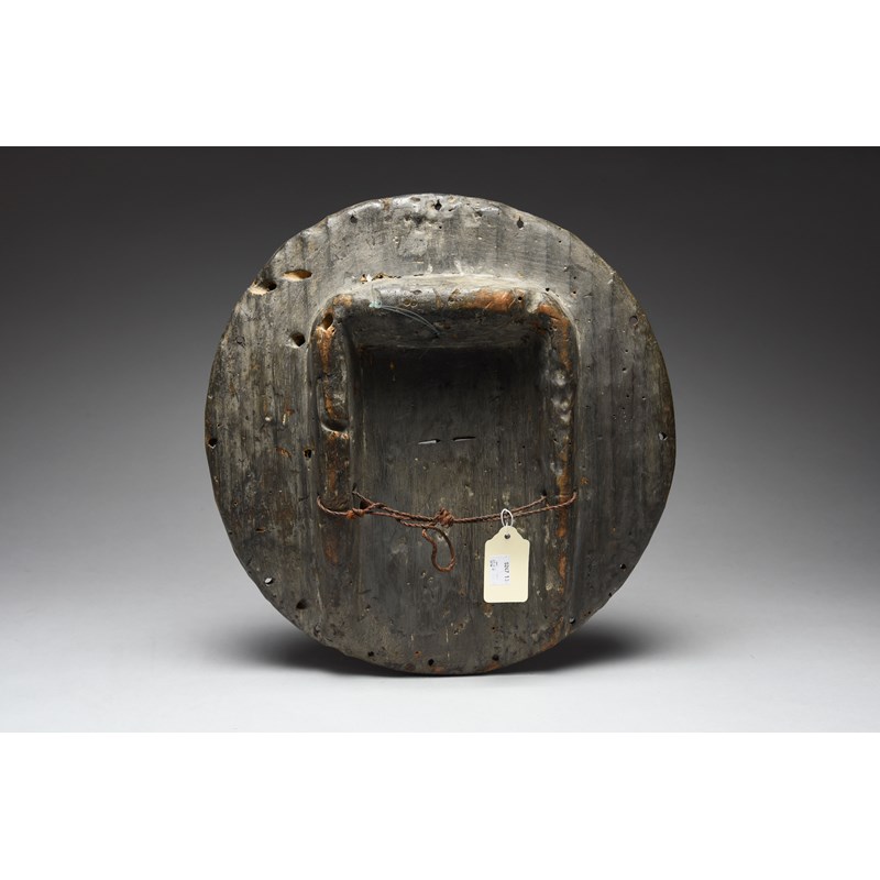 with carved geometric decoration to the two plane face and eye slits either side of the nose, with remains of pigment,