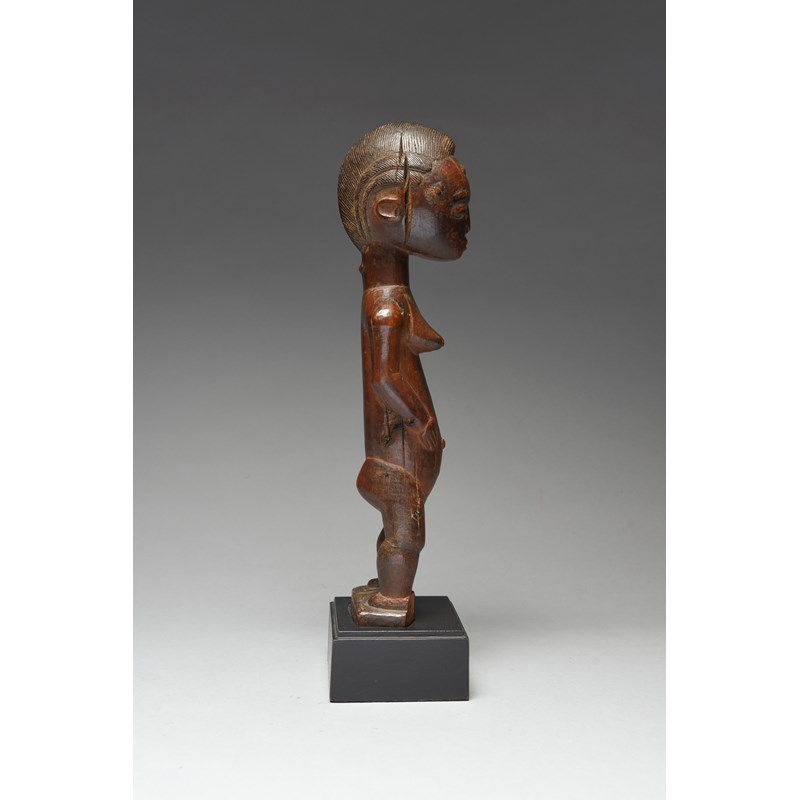 with raised scarifications to the forehead and back of the neck, with a brown / red patina and black highlights,
