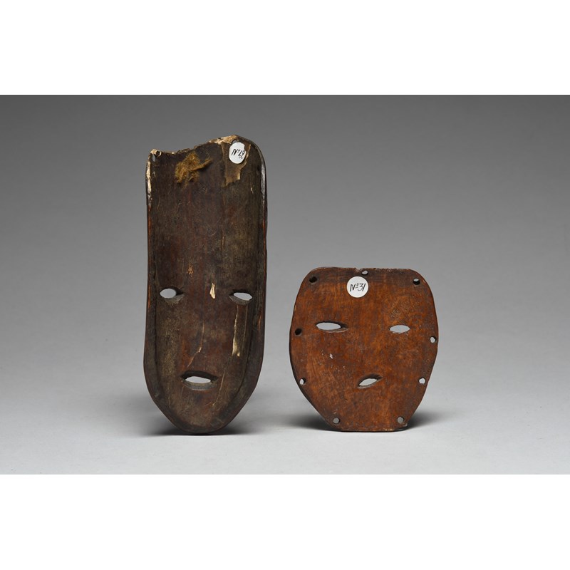 bone, both with pierced eyes and mouths, one curved with incisions around the eyes and mouth and with a linear and dot decorated headdress, the other flat and with circle and dot decoration,
