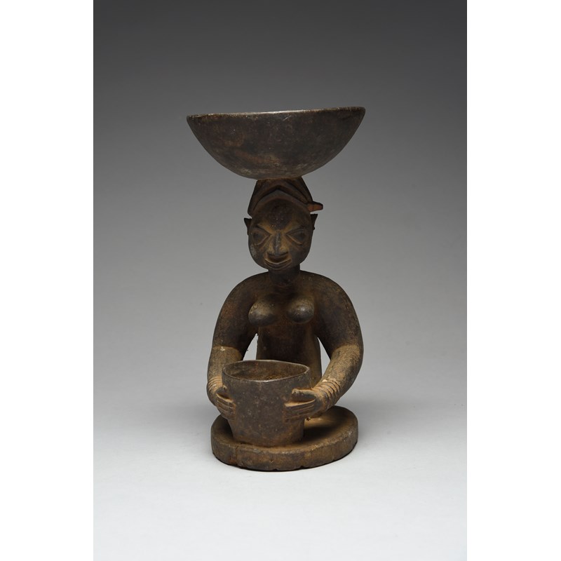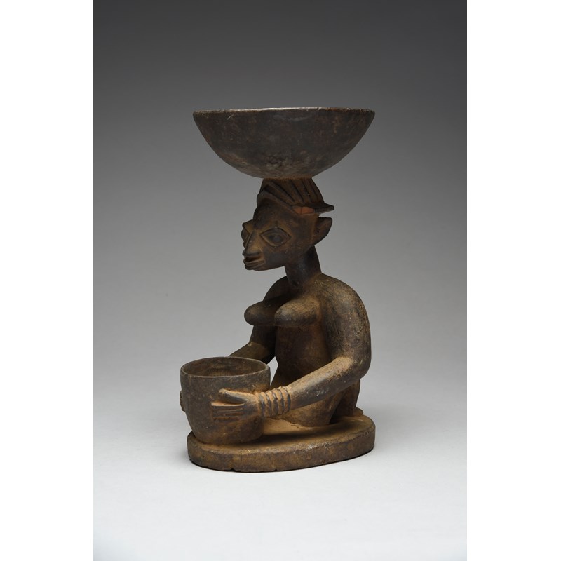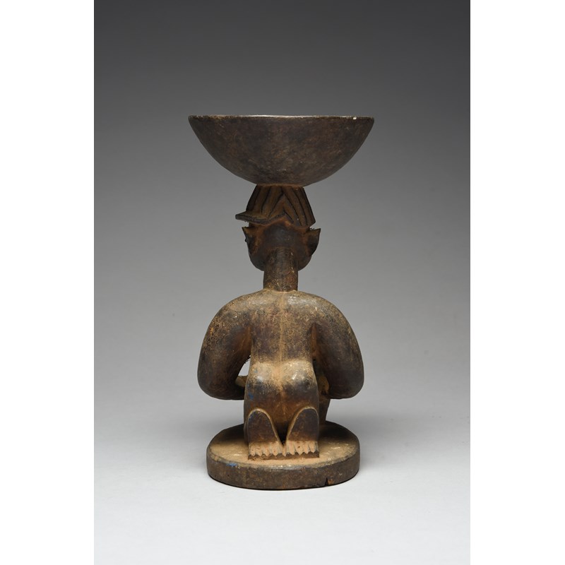 carved as a kneeling female supporting an offering bowl on the ground, wearing bracelets and with a ribbed and side finned coiffure, supporting a bowl on her head,