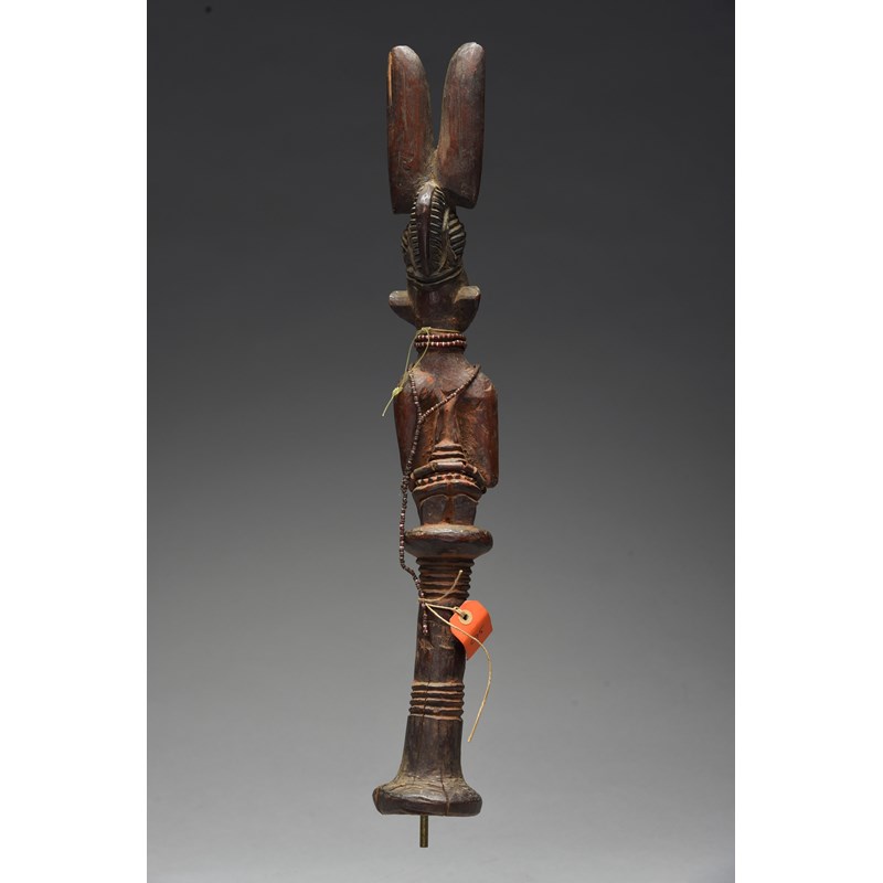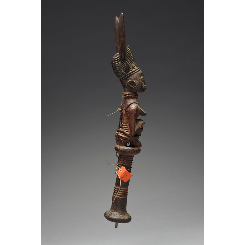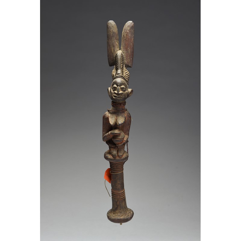 the kneeling female figure holding a covered bowl, with facial scarifications and with a thunder axe to the high coiffure, wearing glass beads and with a ring banded reel type handle,