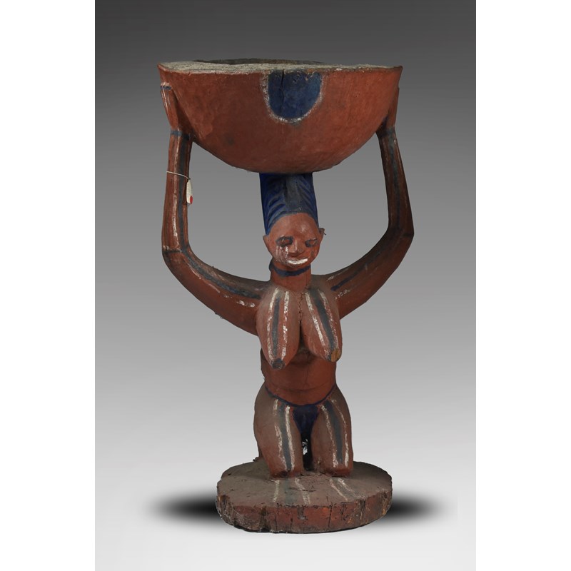 with a kneeling maternity figure with a child strapped to her back, with raised arms and supporting a bowl on her head, with red, black, blue and white pigment,