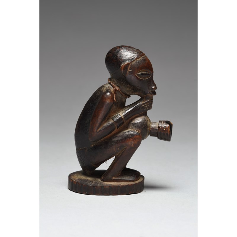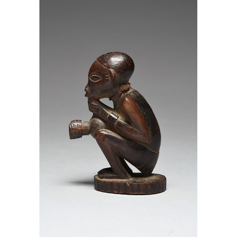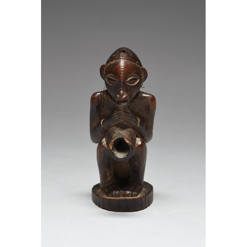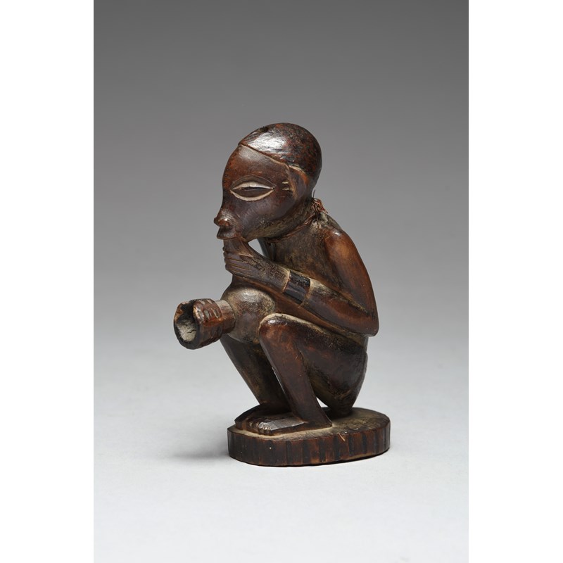 the crouching figure holding a gourd pipe to his mouth, with a cap like coiffure pierced through the top, with burnished highlights,