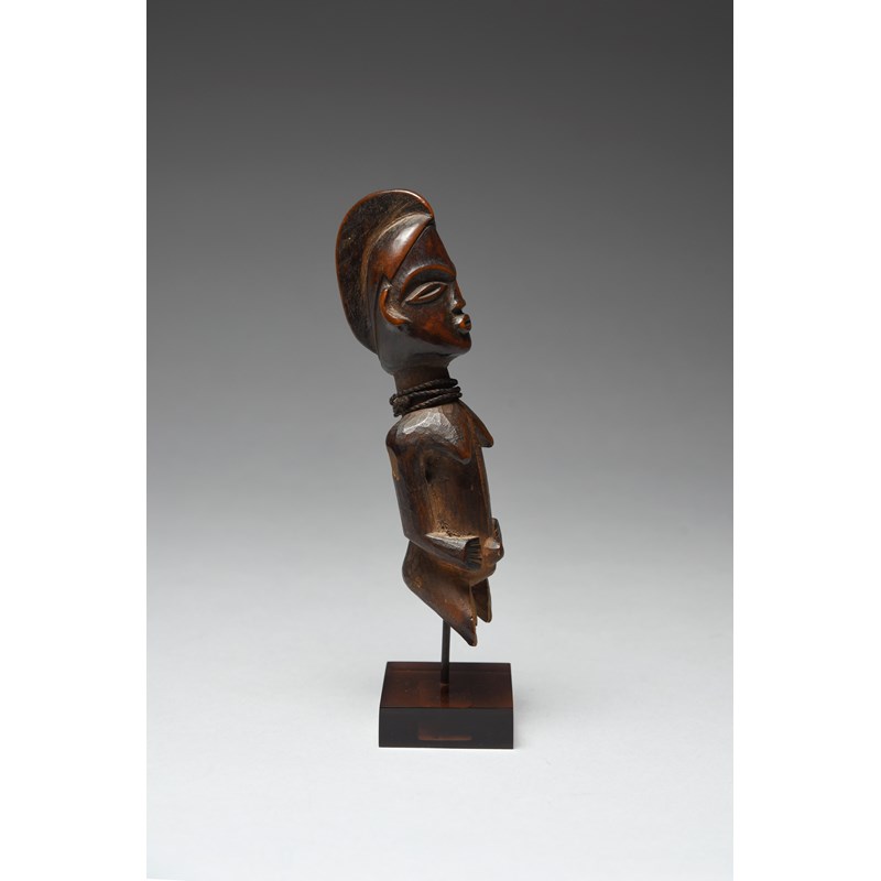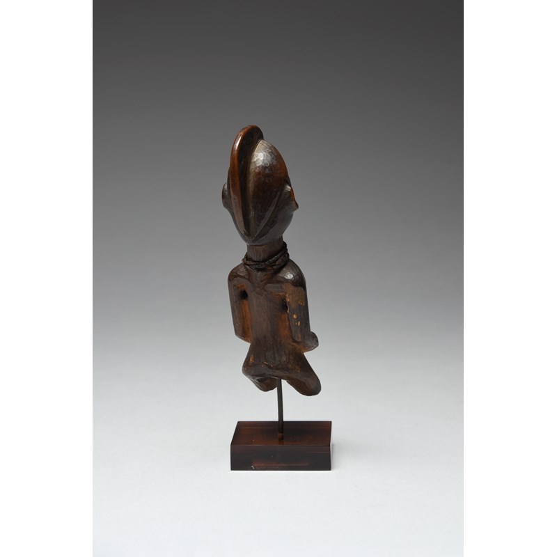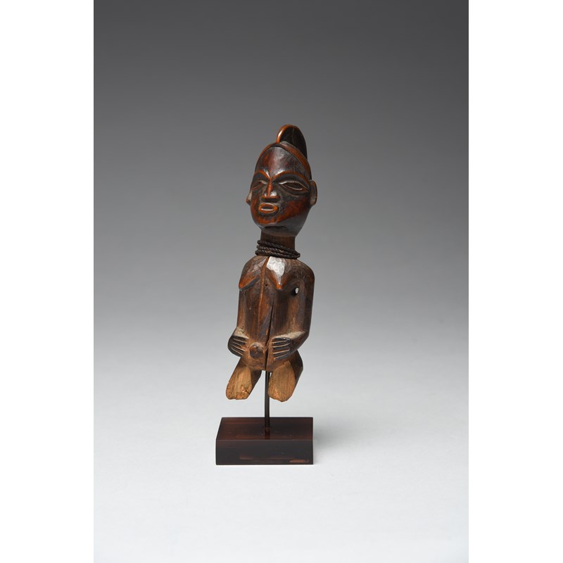 with a crested coiffure and hands placed on the abdomen, with a twisted fibre around the neck,