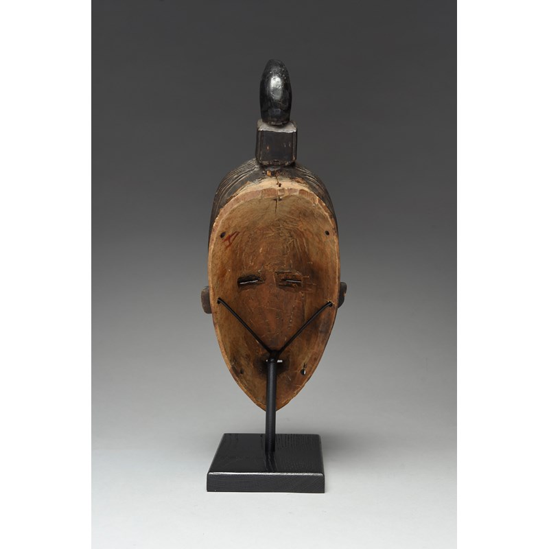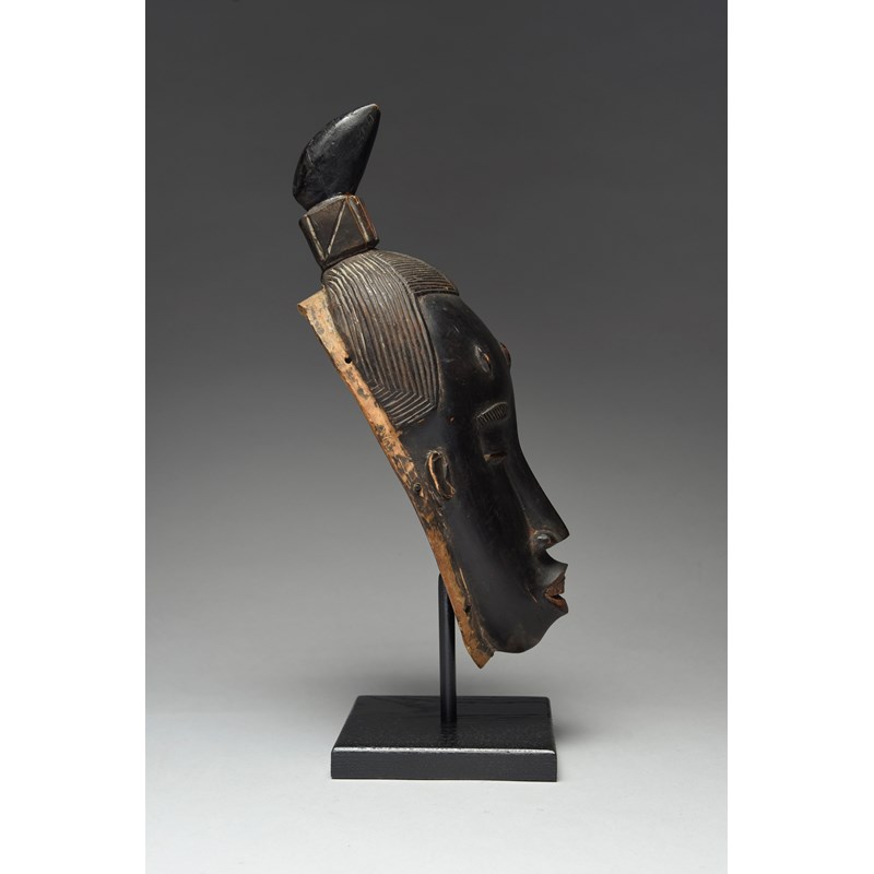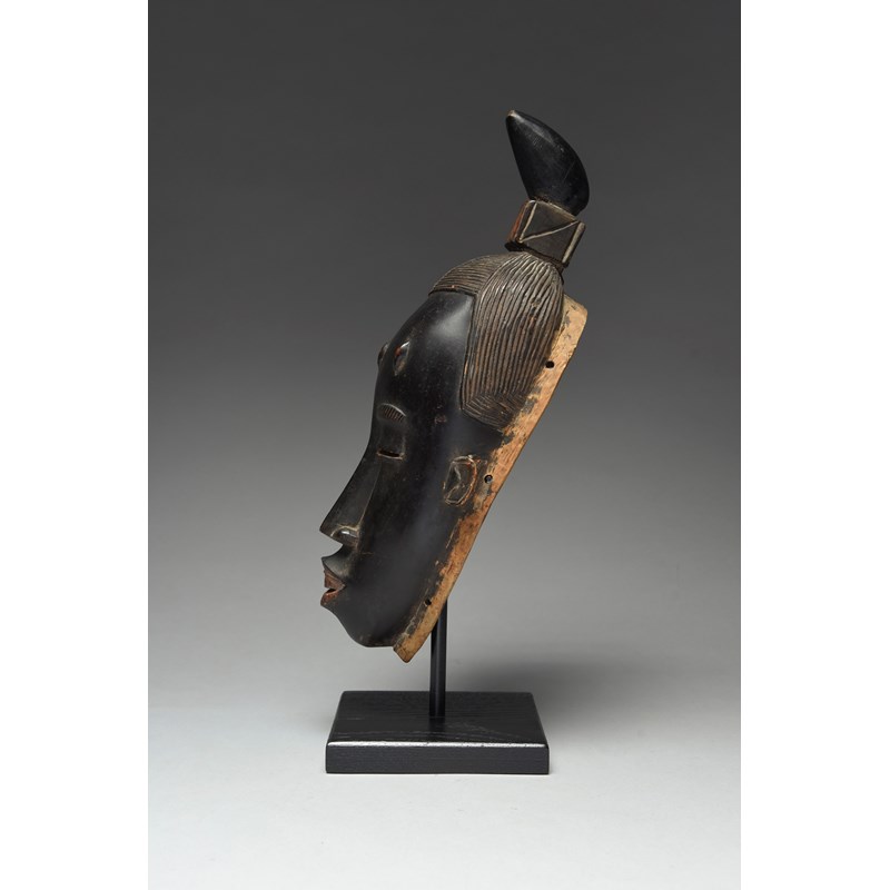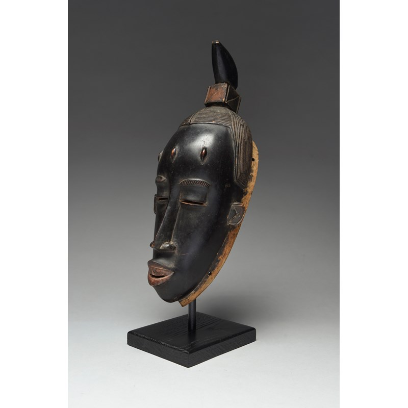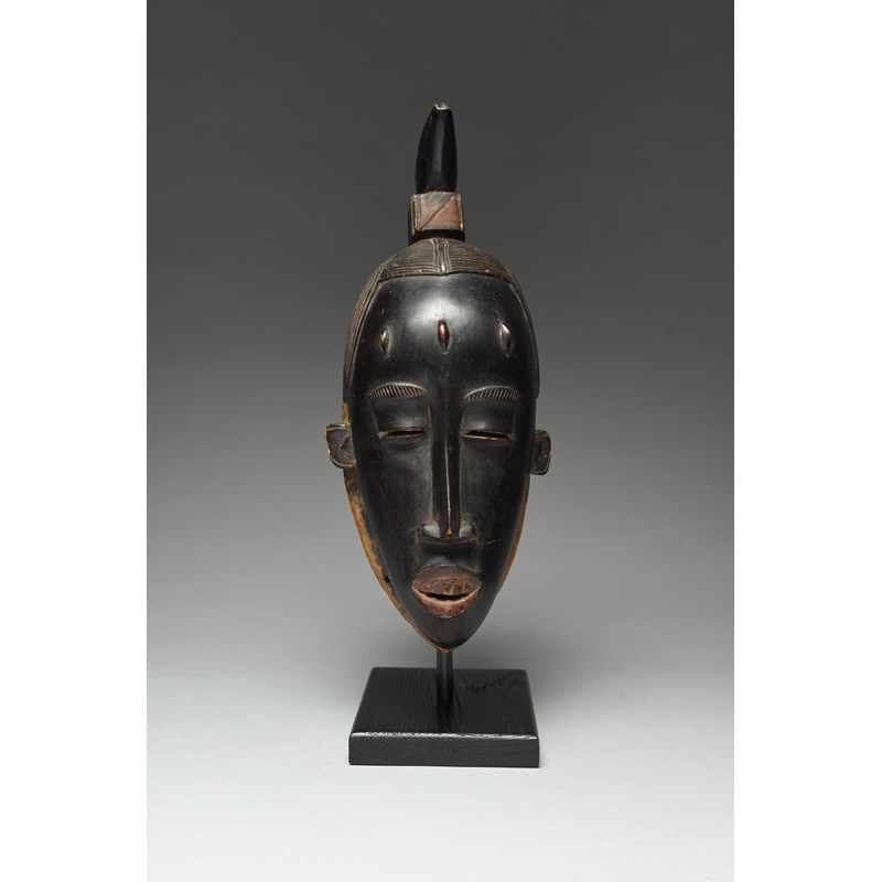 with a gathered up coiffure, three raised scarifications to the forehead, slit eyes and an open mouth with teeth, black and red paint,