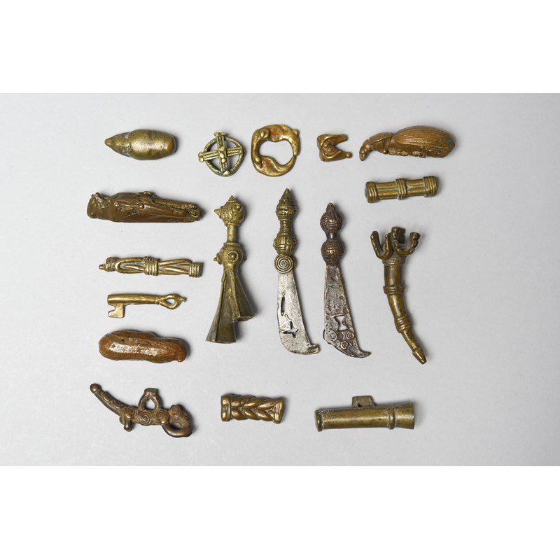 cast brass including a cicada, two beetles and a ground nut, two swords, a cannon, a pair of drums, a bell, two plaited ropes, a key, a war trumpet, on a stand, bound rods, a headdress, stylised animals as a circle, and a Lobi pendant,