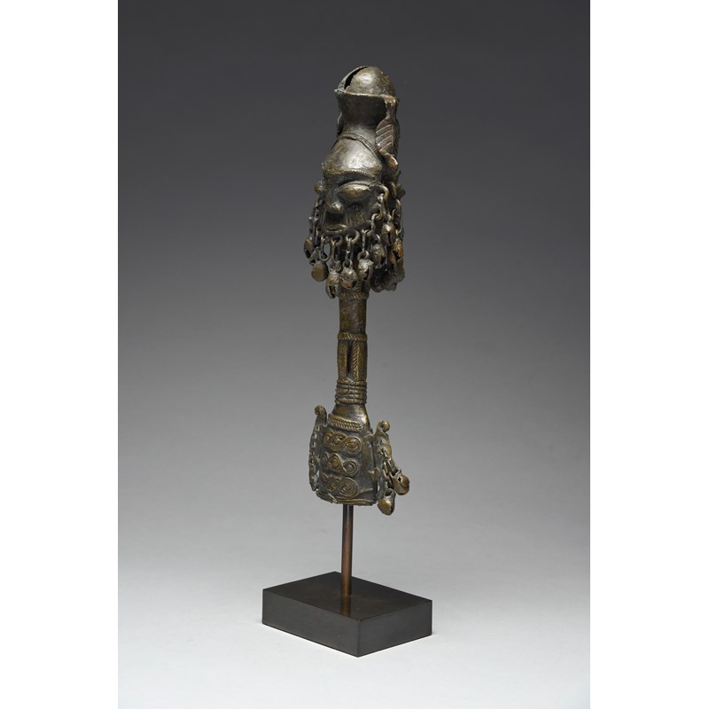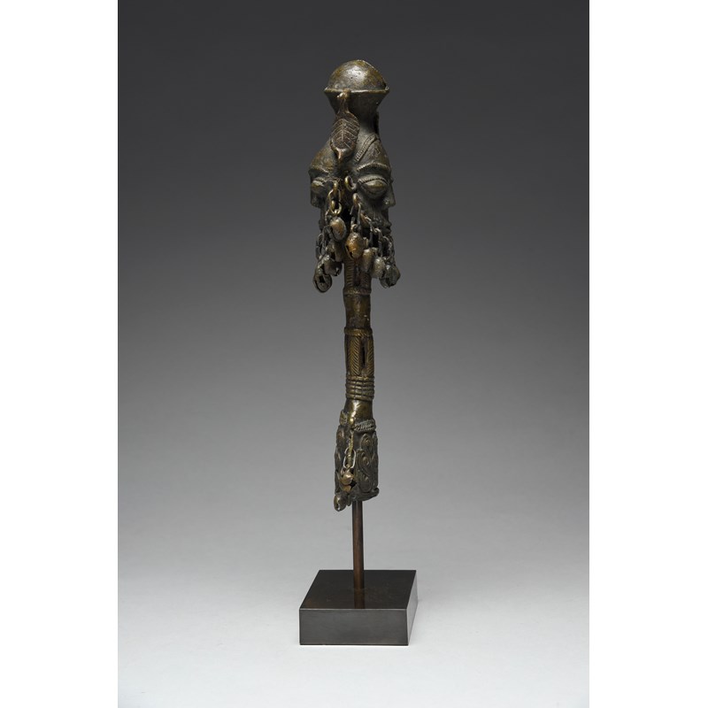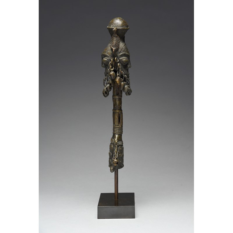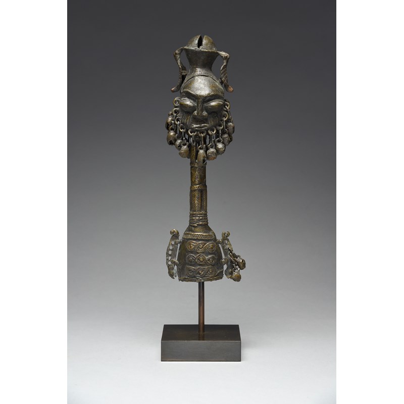 cast bronze with the two heads hung with bells and with a bell finial having bird supports, the part open shaft with an eliptical bell shape base with an internal spike and chameleons to the sides, one hung with two bells,