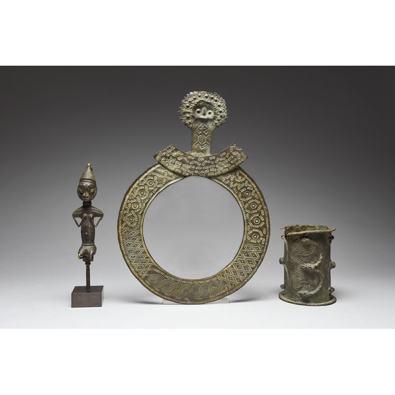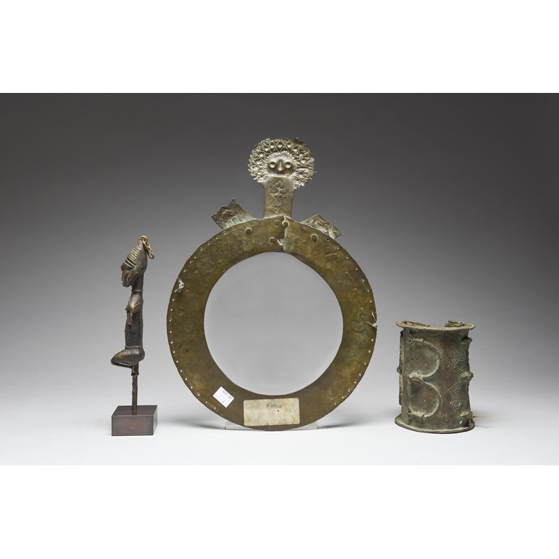 a Yoruba bronze edan staff, of a seated female, 23.5cm high, in a stand and a bronze disc ornament with stamped geometric decoration and a head terminal, 38.5cm high. (3)