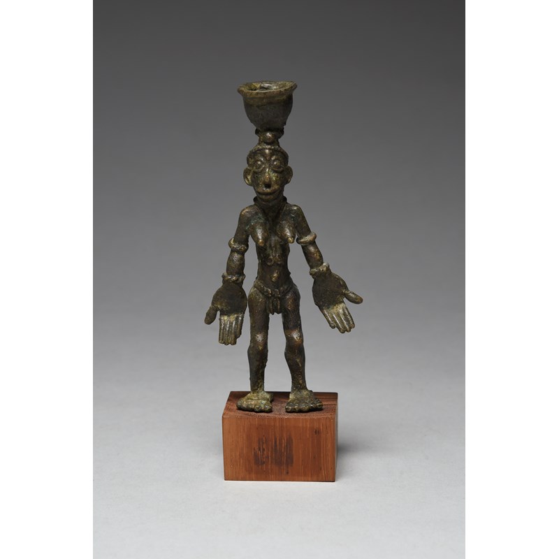 bronze, with a water pot on her head and with body ornaments, having large hands facing forwards, with white painted collection number X89-792,