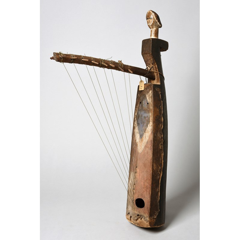 with a carved head finial having an oval channelled coiffure with pigment and wire earring loops, the main body with a skin decorated with pigment and the arm with eight strings and pegs,