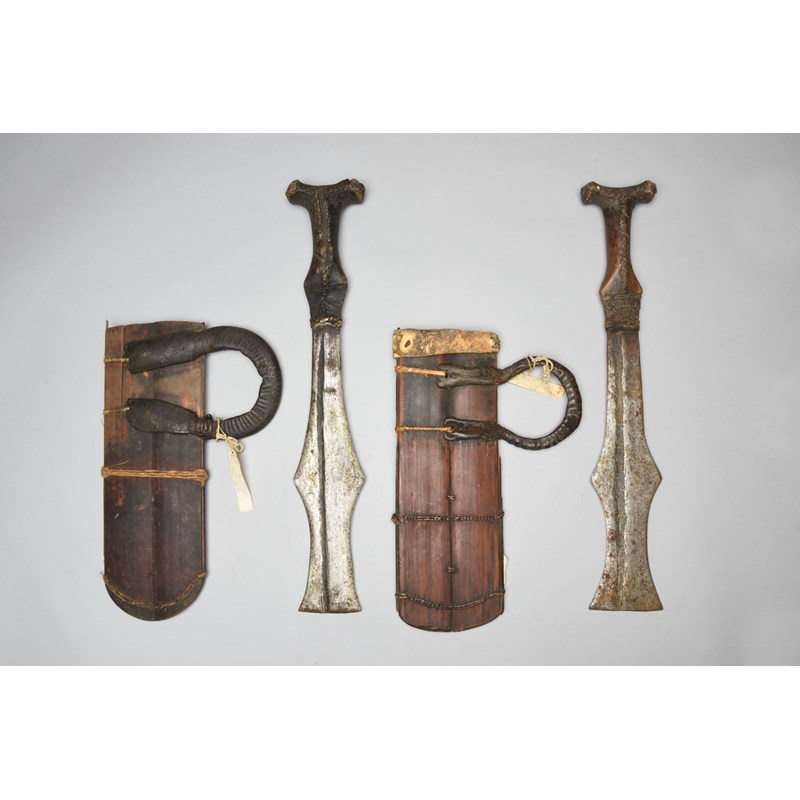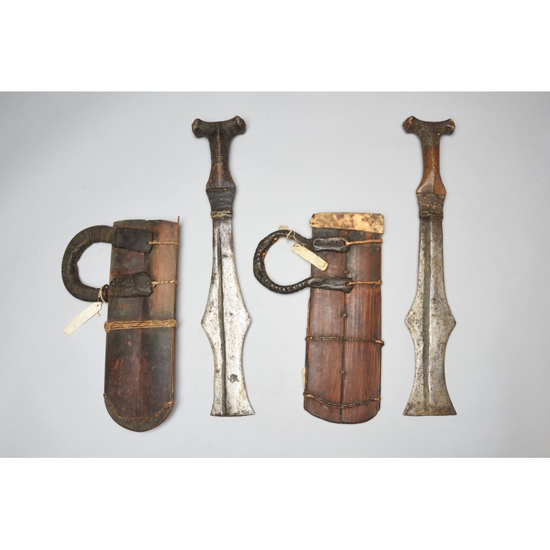 with shaped steel blades and hide covered wood handles, the bamboo scabbards with hippopotamus hide handles, with collection labels Working matchet Mfunte tribe, Bamenda. Forged at Kwedja, purchased at Ntong...June 1948,