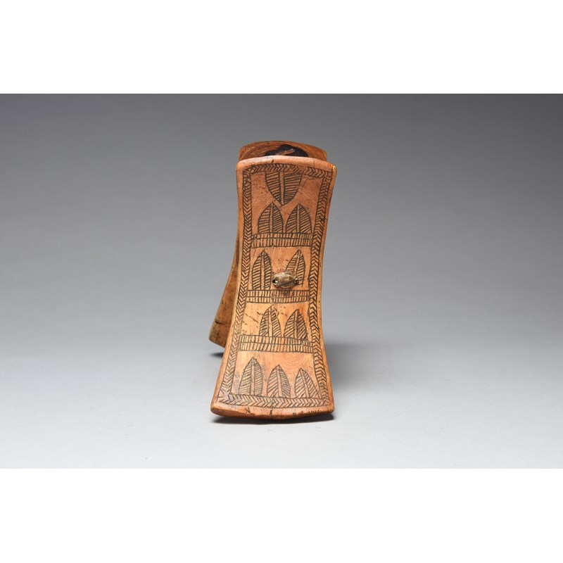 the sides decorated with incised panels of leaves and with a hide stretcher,