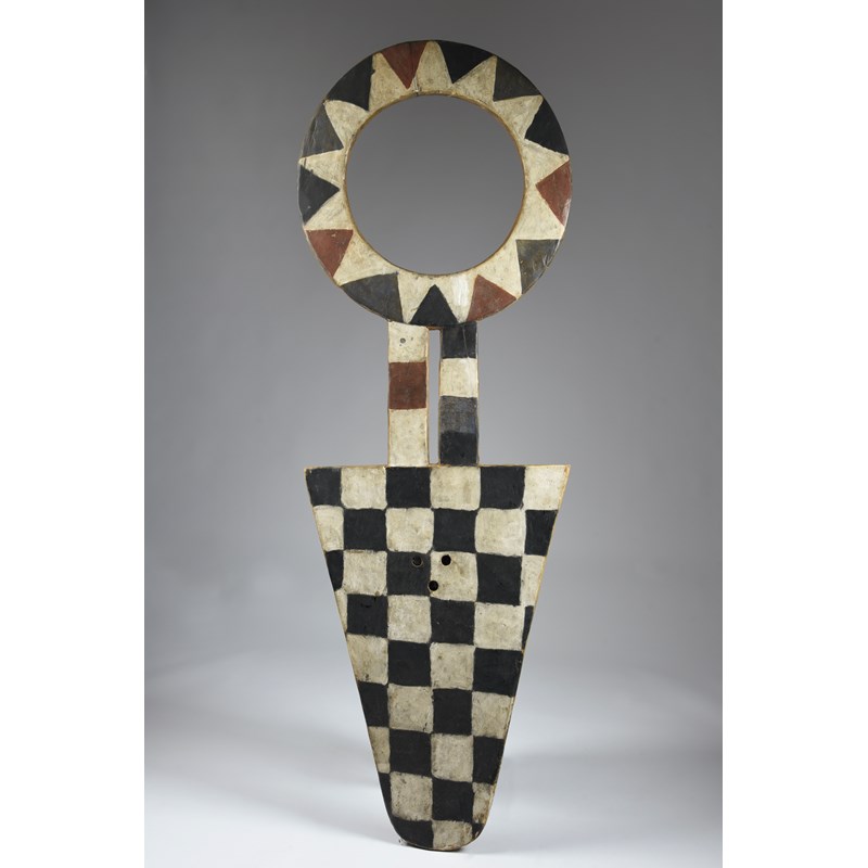 modelled after a buffalo, with three holes to the face, with red, black and white paint, the back with integral support ridges,