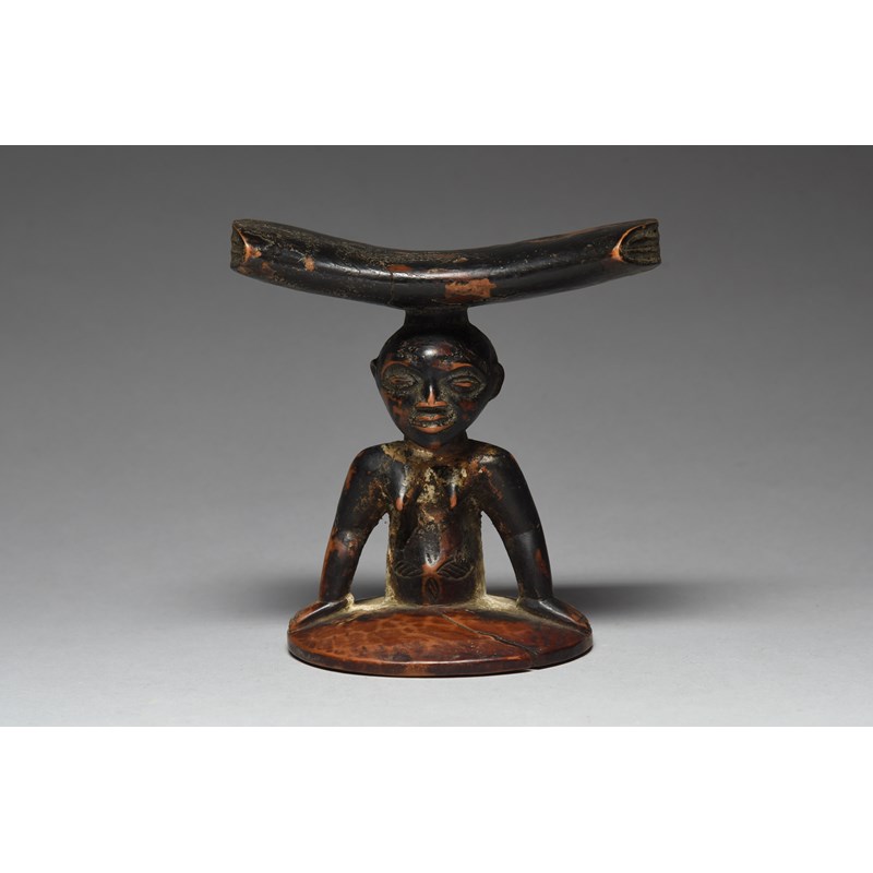 the top with linear carved ends with a female half figure support, with a horizontal linear back coiffure, scarifications around the navel with with her hands places flat on the circular base,