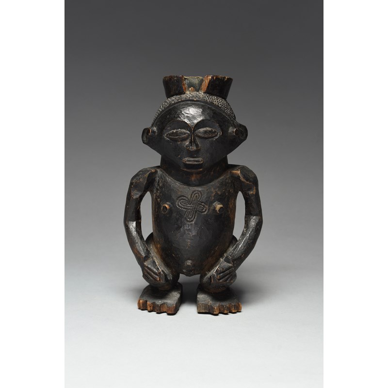 carved as a squatting female with her hands placed on her knees and with inset metal eyes and symbols to the chest and back,