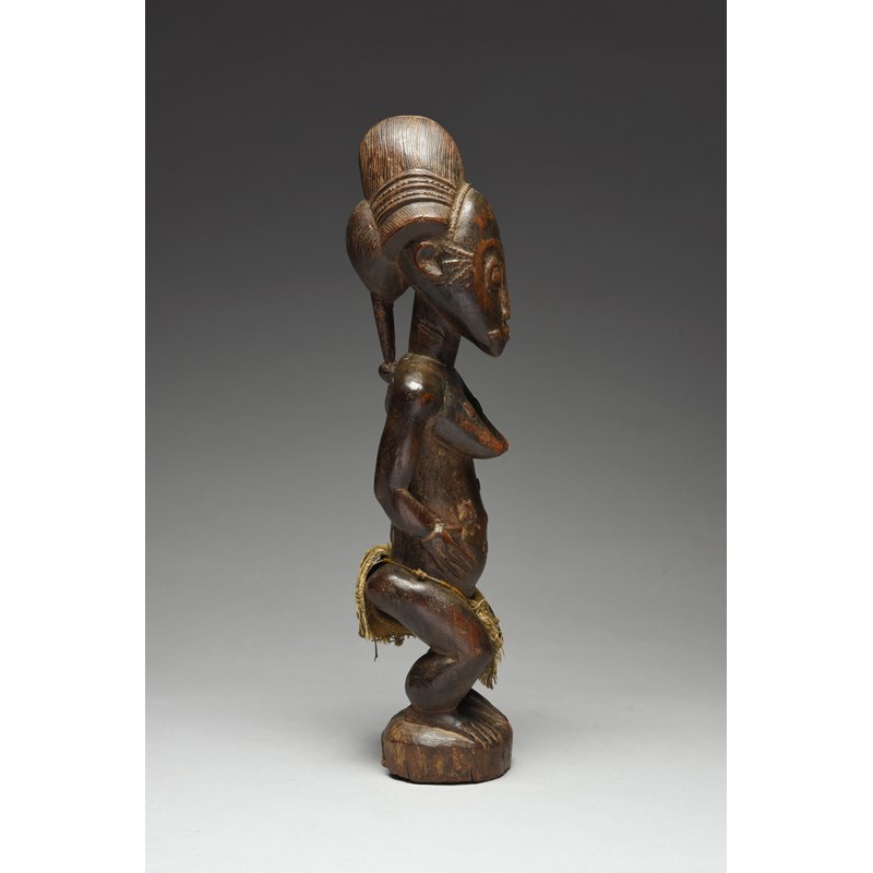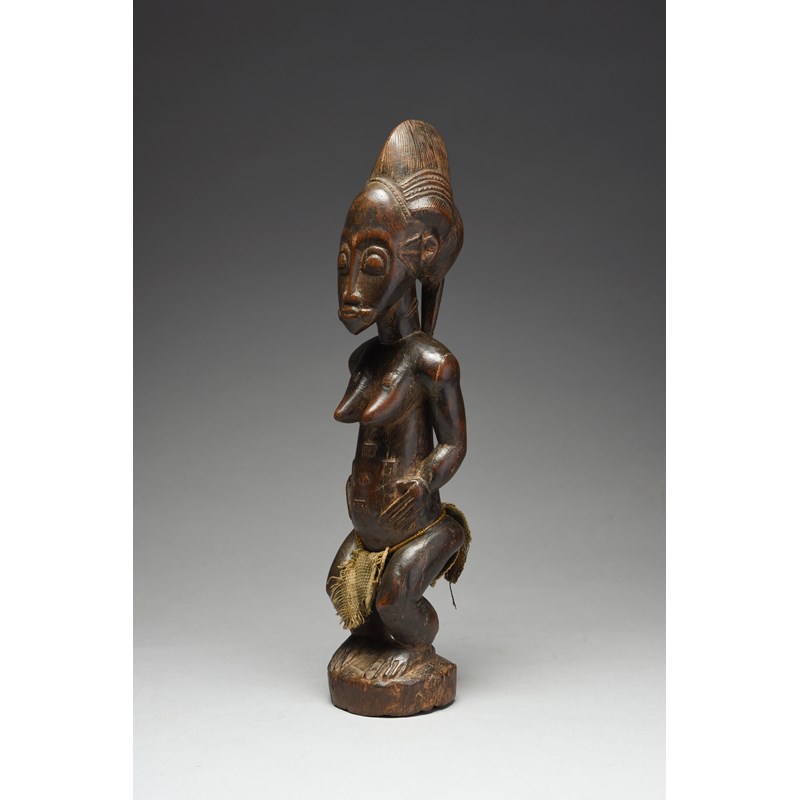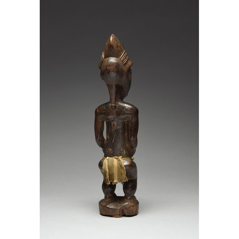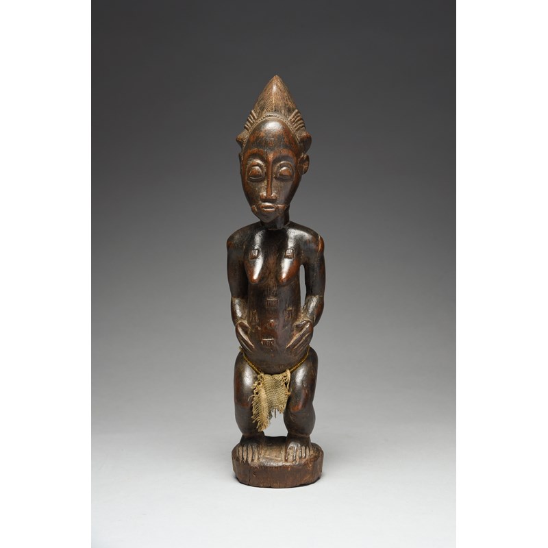 with an elaborate coiffure and with facial and body scarifications, wearing a loin cloth with a glass bead waistband,