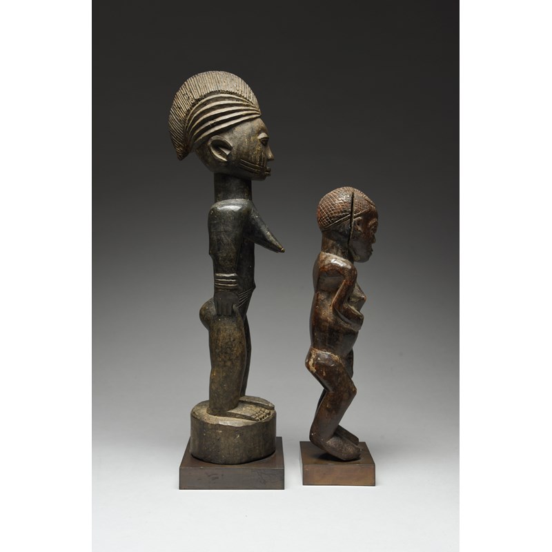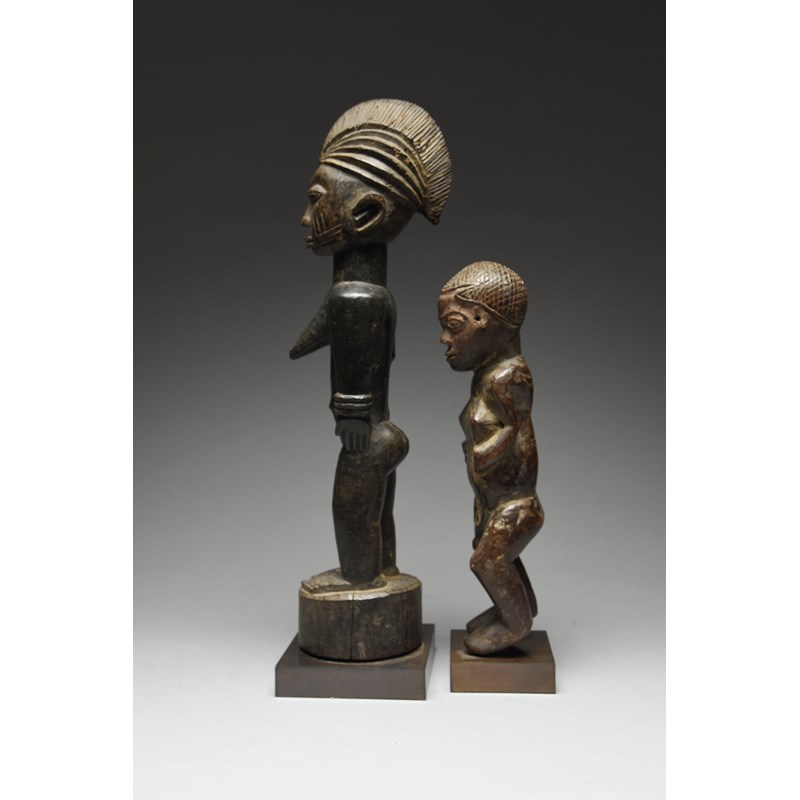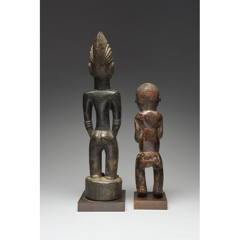 and a Yoruba standing female figure, with a crested coiffure and with facial and and abdominal scarifications, 48.5cm high, on a stand. (4)