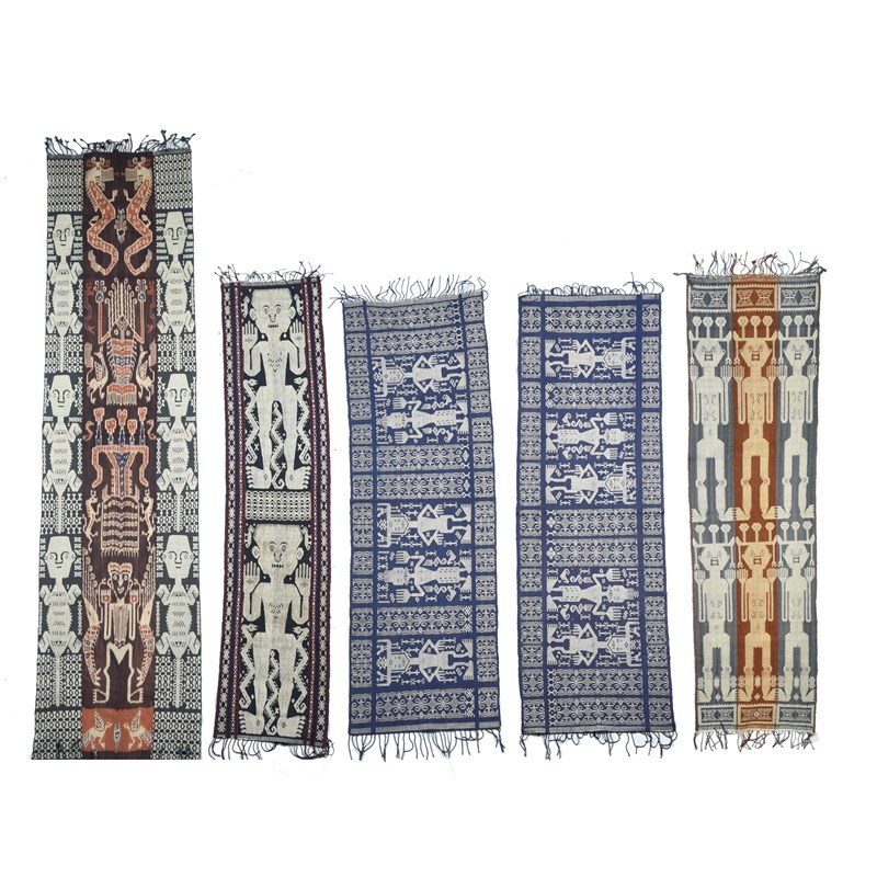 and three Sumba ikats, with figures and one with a central band of dragons, a lobster, house of heads, a figure and other animals, 187cm x 50cm, 182cm x 40cm and 250cm x 60cm. (5)