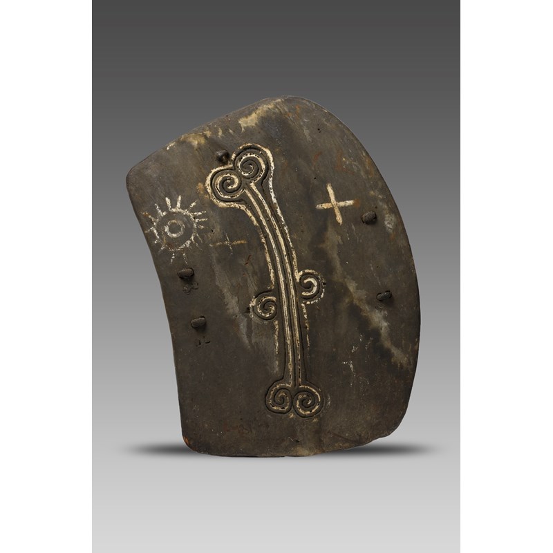 with a carved linear and scroll motif, highlighted with white pigment and painted a sun and two X's, with an encrusted patina and with fibre and cloth strap handle,