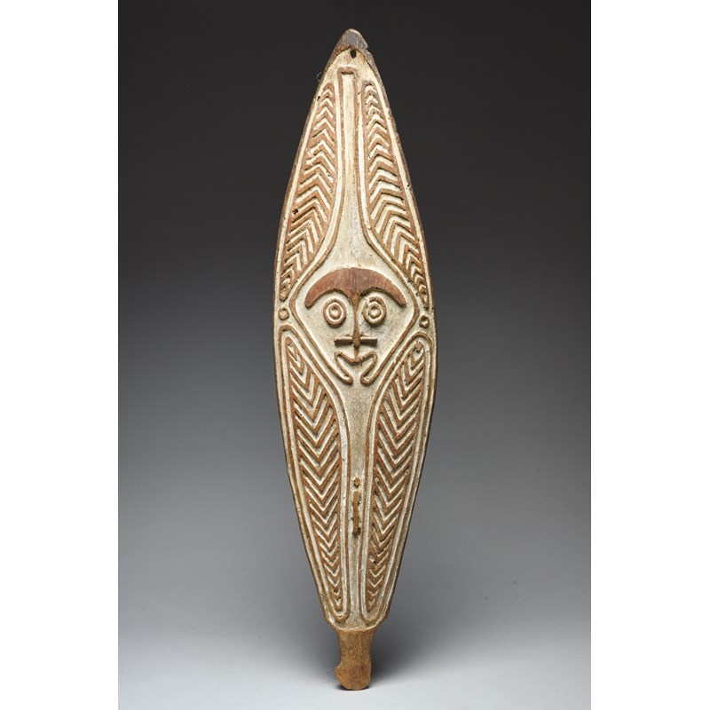 with a central carved ancestor mask with a pierced septum, with a peg and with carved chevrons above and below, with traces of red paint and with lime pigment, the back inscribed OC 20 in white paint,