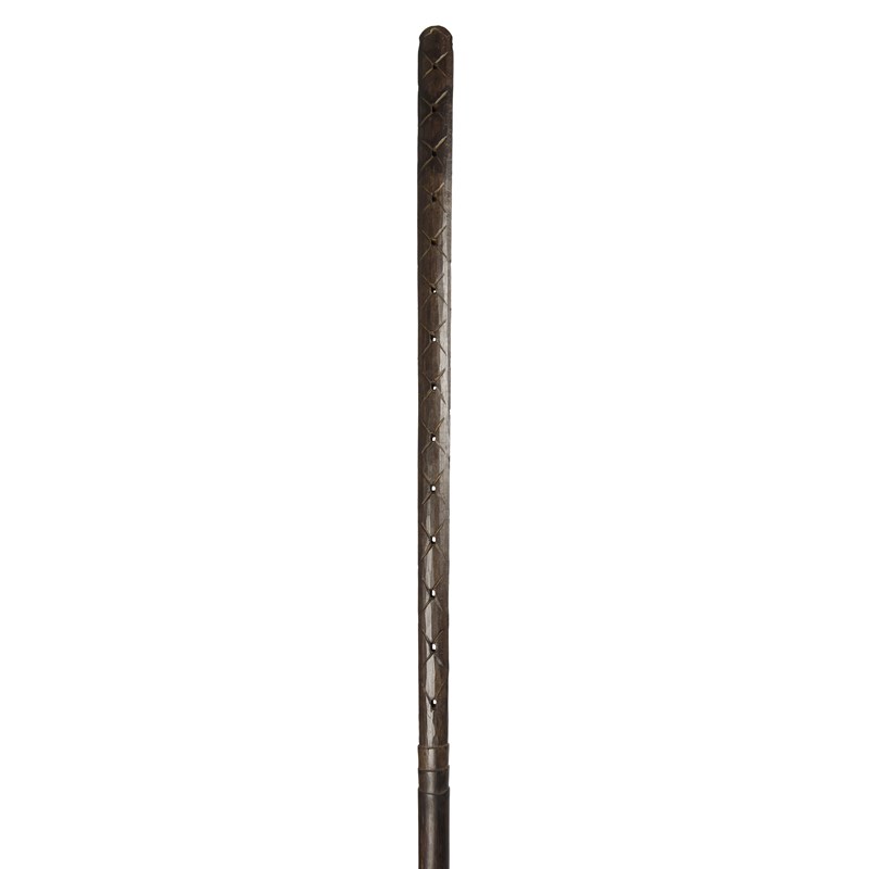 the flattened end pierced and with locating grooves, the sides with small recesses, possibly for shark teeth,
