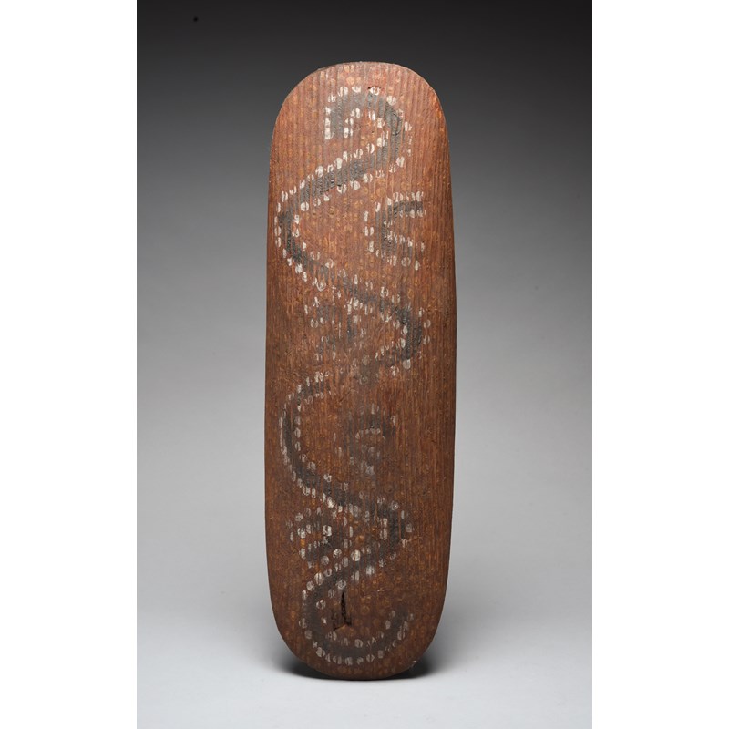 with a carved channelled surface and integral handle, with an all-over red pigment and dot decoration to the front,