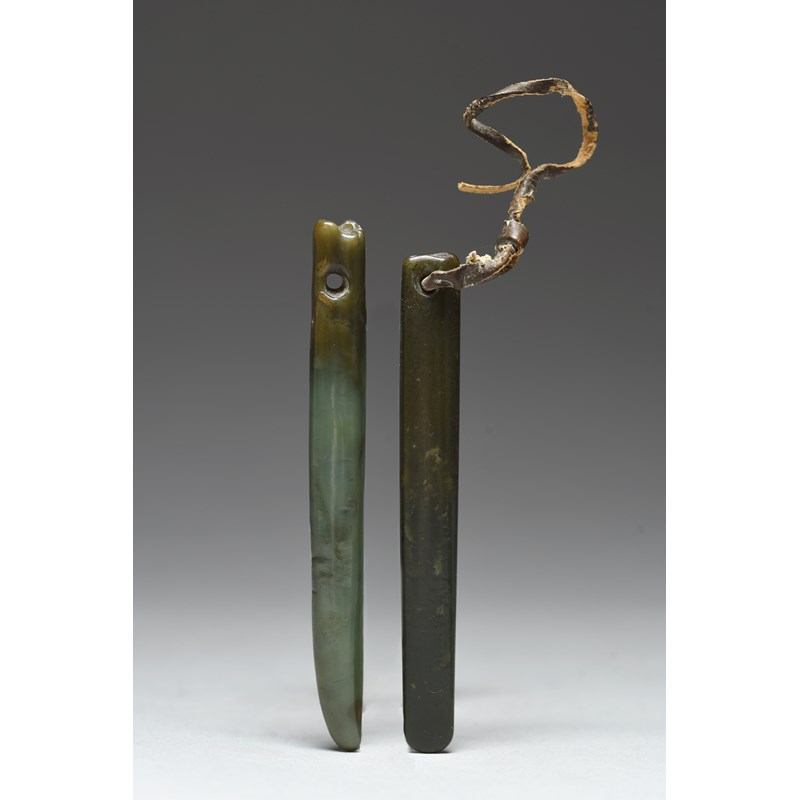 nephrite, both pierced, one with a curved end and grooves either side of the attachment hole, 11.1cm long and the other with a rounded end and with flax to the attachment hole, 10.5cm long. (2)