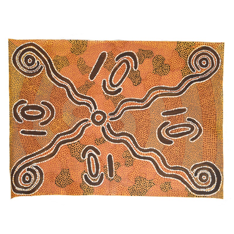 the back inscribed It belongs to Nakamara, Jakamara, Juburula, Nuburula, Its the old people's tucker, they used to eat these spinafex, and it was done by Rayleen Foster 1992, with a Burnt Shirt Gallery stamp.