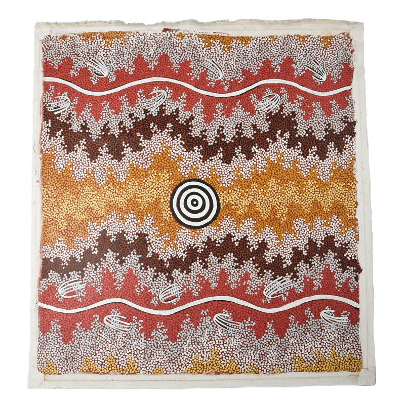 The painting shows a central waterhole, surrounded by perenti (goanna) tracks. The different coloured dots representing the surrounding countryside while the grey dots are the rain carrying clouds overhead.