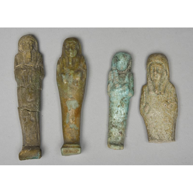 an Egyptian faience shabti torso fragment, 7cm high, and an Egyptian faience shabti, with hieroglyphs to the front, broken in four pieces, 10cm high. (7)