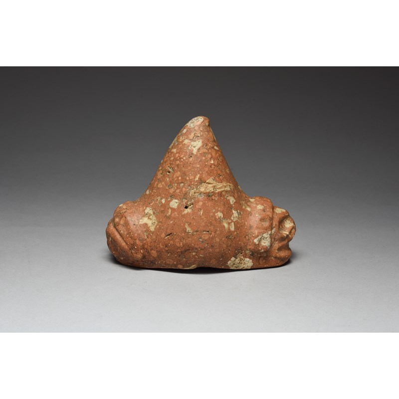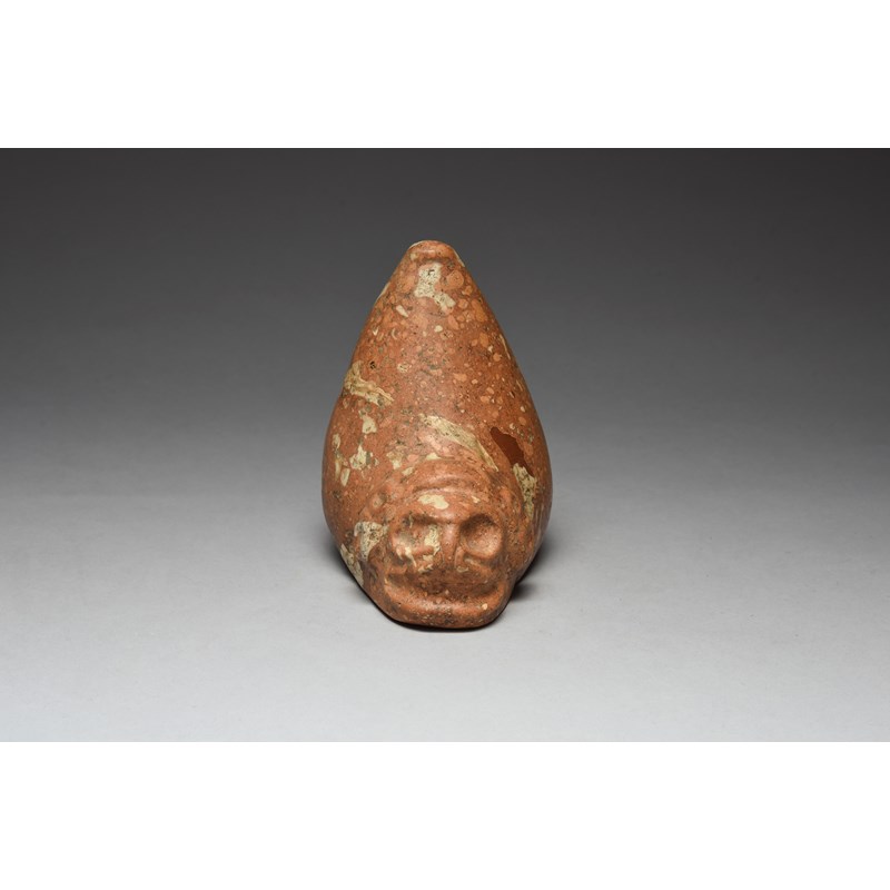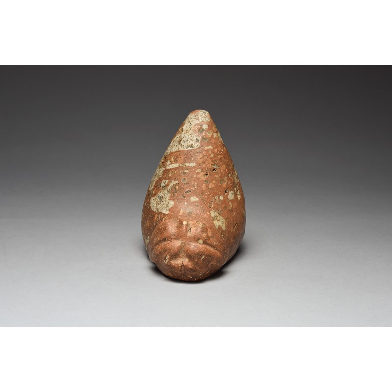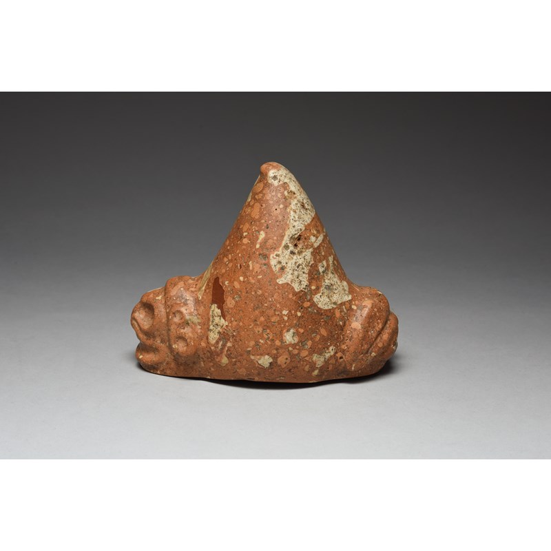 red and white mottled stone, carved a crouching zemi figure with recessed eyes, wide open mouth, headband and bent legs, the swollen central point with a curved tip, the underside concave,
