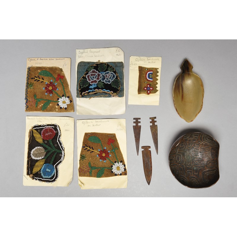 a horn scoop, three Sioux metal arrow heads, and a copper bowl with abstract relief designs to the interior, 11cm wide. (10)
