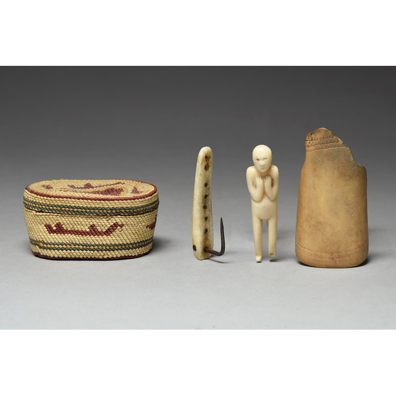 an Inuit fish hook, walrus ivory, baleen and a nail, 7.8cm long, an Inuit marine ivory wrist guard fragment, 9cm long and a Nootka small oval basket and cover, 9cm. (5)