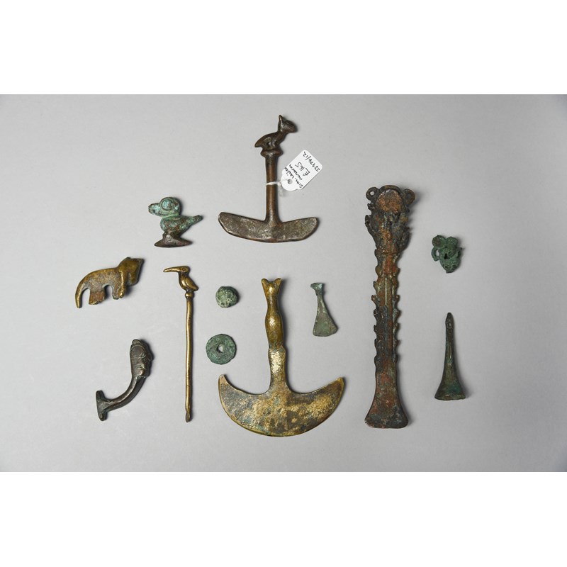 an Inca cast brass tumi, depicting a figure with a jaguar head finial, 8.7cm high, an Inca cast bronze condor mount, 2.7cm high, a Moche cast bronze atlatl thumbpiece, with a jaguar head terminal, 3.2cm high, a Moche cast brass spatula, with a bird finial, 8.37cm long, a Moche cast copper tumi, with a figure finial wearing a headdress and holding a staff, 13cm high, and six metal ornaments, including a set of tweezers, a feline, a trumpet shape pendant, a disc bead, incised linear scrolls, a finial with a head and bells, and a sphere. (12)