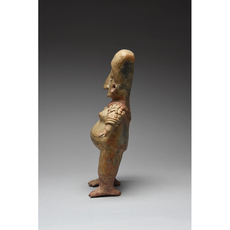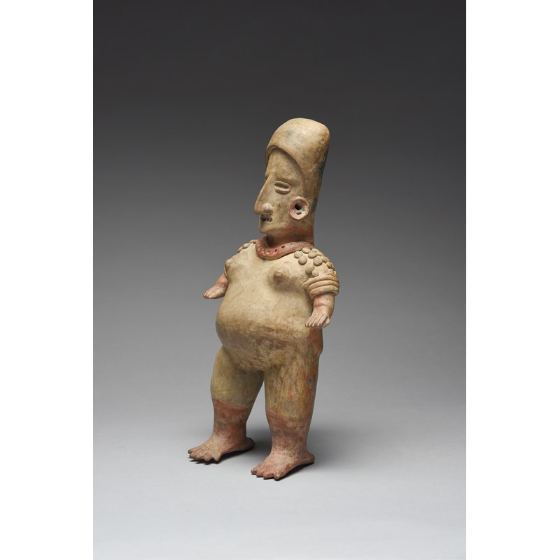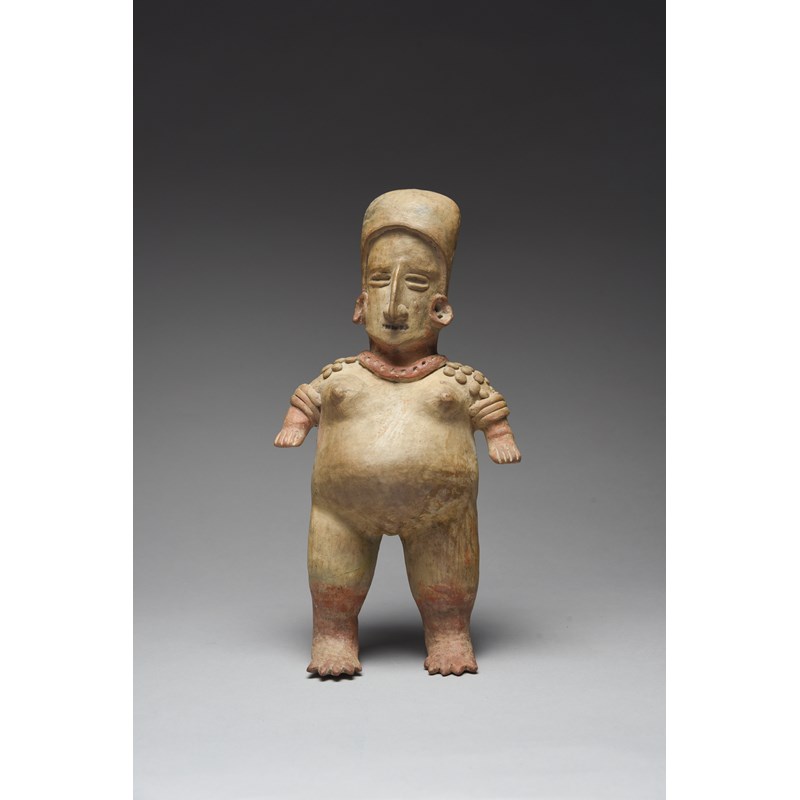 pottery, with a headdress, ear ornaments, a necklace and disc ornaments to the shoulders, and with armbands on the short arms, with red pigment and traces of black pigment to the breasts and the back,
