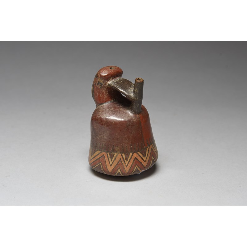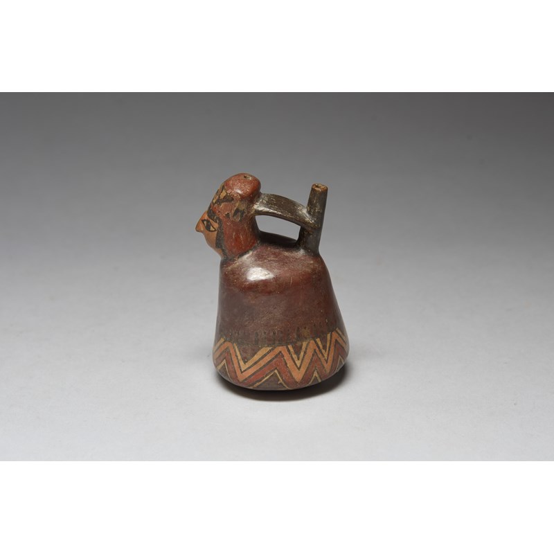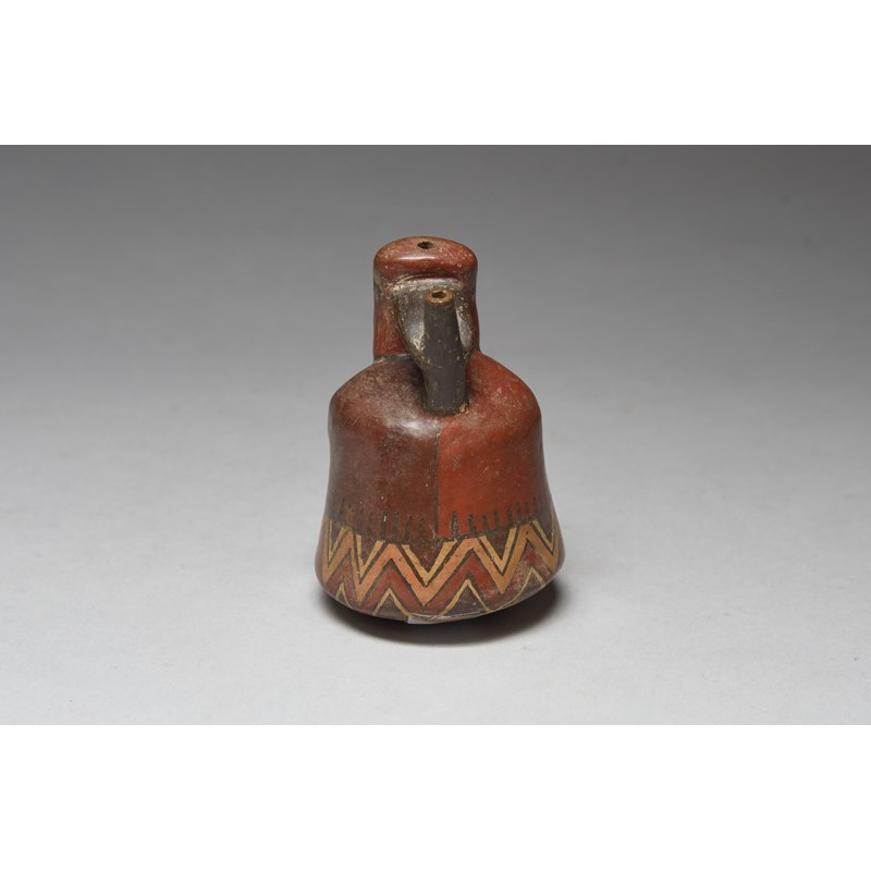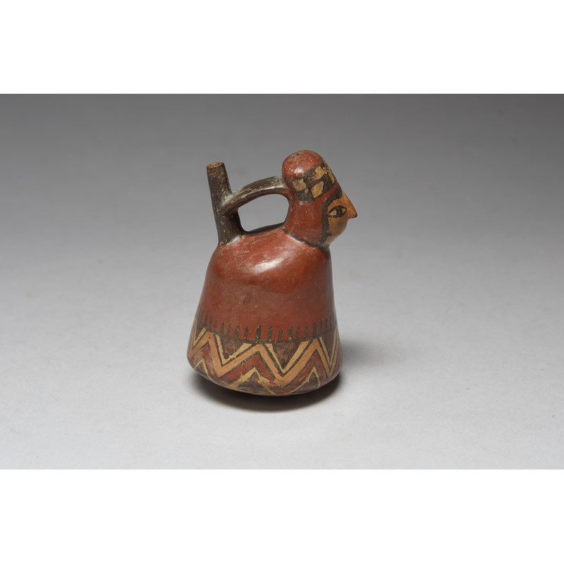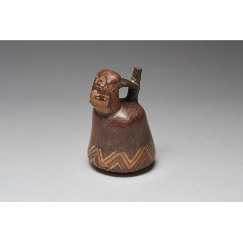 pottery, with a spout linked to a head, painted wearing a chequer headband and a poncho,