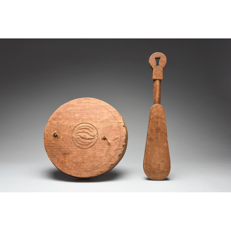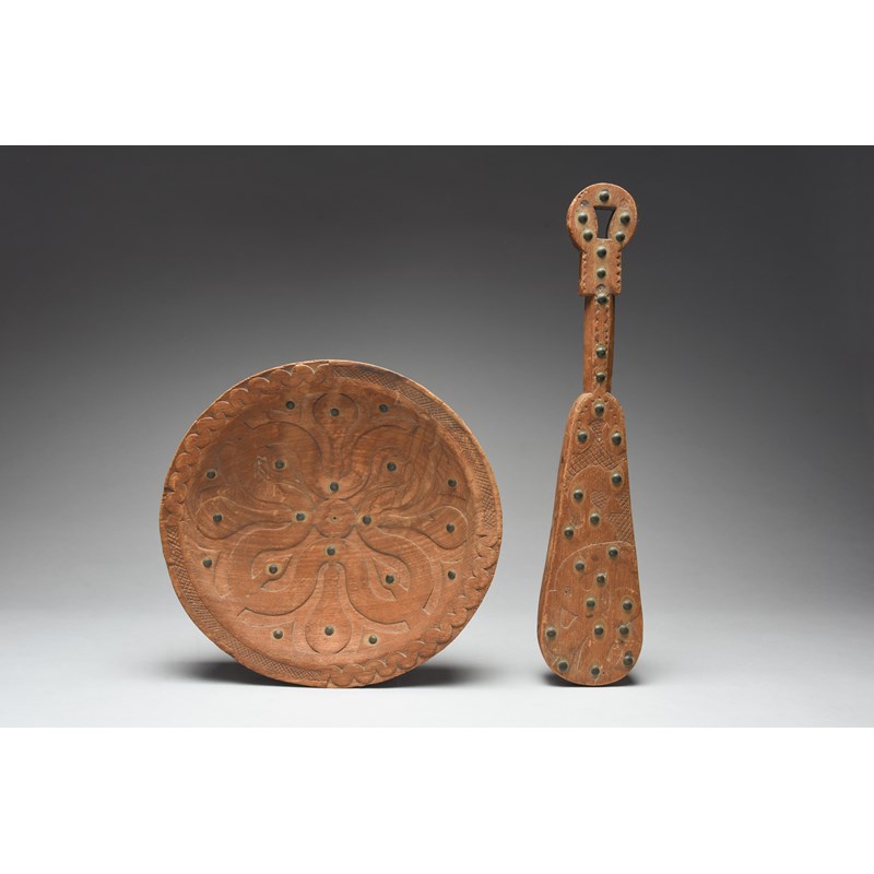 and a Maroon cloth beater, relief carved a bird head and scrolls, with brass studs, 45.5cm long. (2)