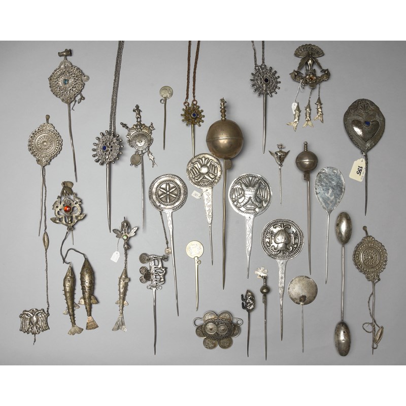 silver coloured metal, including six with pierced disc ends, five with embossed discs decorated double headed eagles, a vase with flowers, a heart with peacock and foliage, three with spherical finials, three with peacocks and articulated fish, and eight other pins, including a horse and deer, a mouse, coins, a sun with figures, a dog and a fish, a bird on a flower, a disc and an oval, an articulated fish pendant, a coin brooch and a pin with ovoid screw off ends,