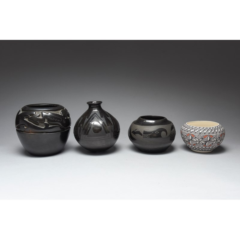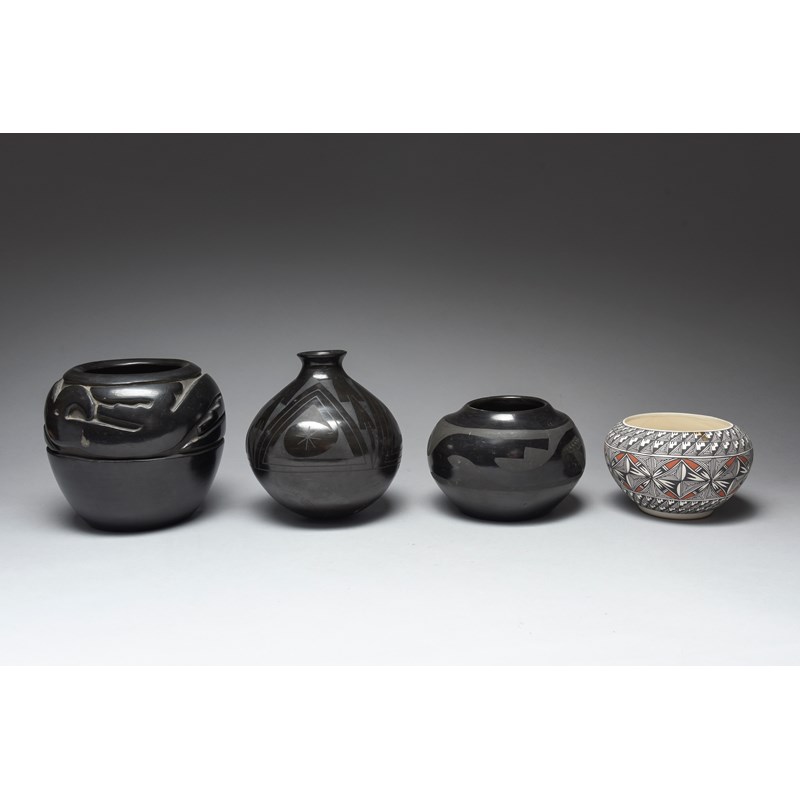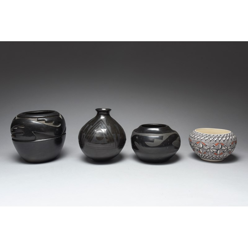 a San Ildefonso blackware pot, painted in matt on a polished surface with an encircling avanya, the base signed Ursualita Naranjo, Santa Clara Pueblo, 11.5cm high, a Pueblo blackware jar, with stylised decoration in matt on a polished surface, the base signed Tomasa Mora, 17.5cm high, and a Laguna Peublo bowl, painted with geometric decoration in black and red, the base signed R. Reano, Laguna, N. M., 9.9cm high. (4)