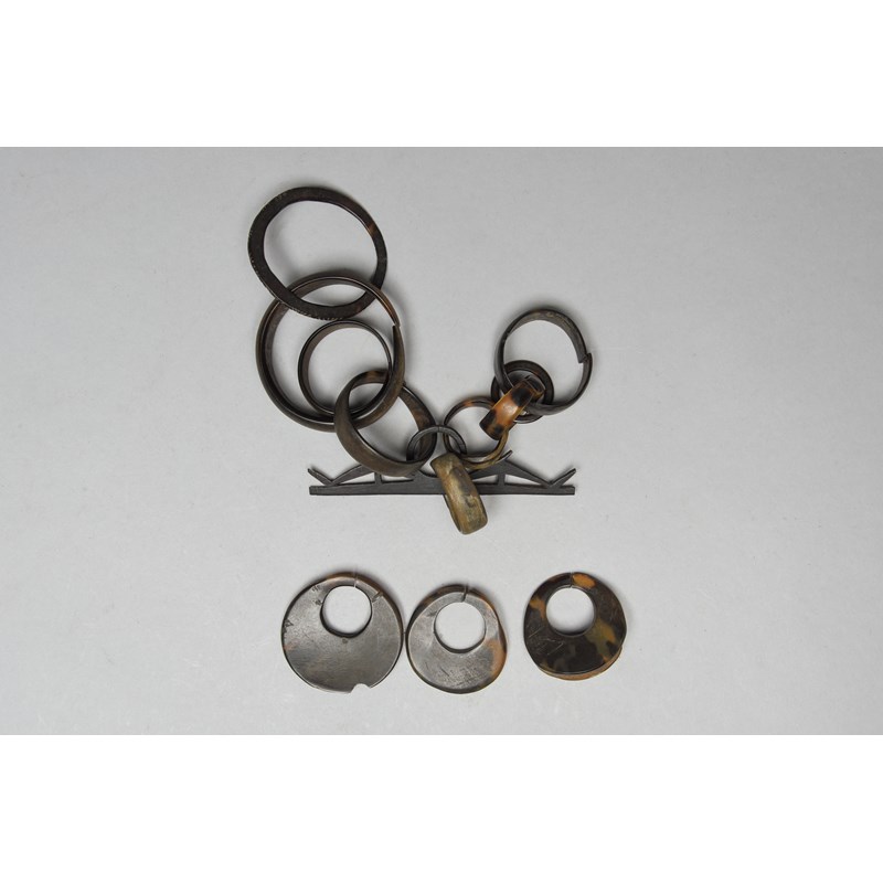 turtleshell, with a carved bar representing fish and with nine attached rings,