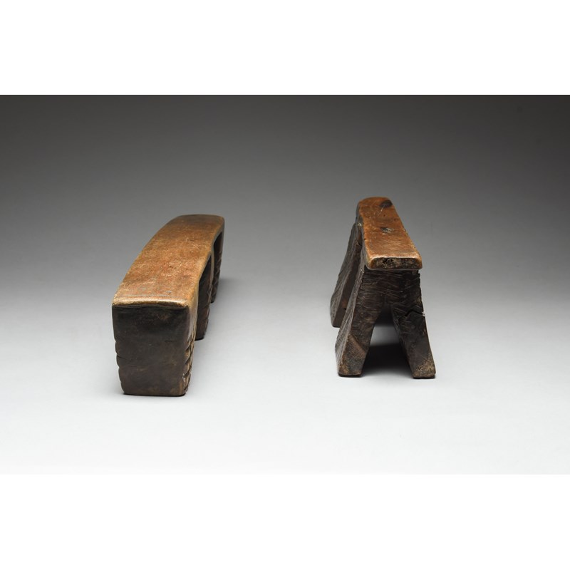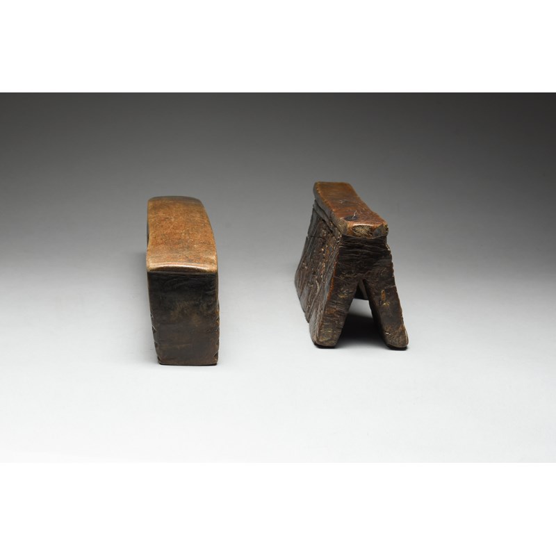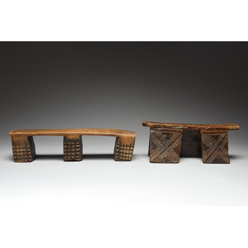 and a Zulu headrest, with a block support to one side and two supports to the other, all with carved decoration, 13.5cm high, 33cm long. (2)
