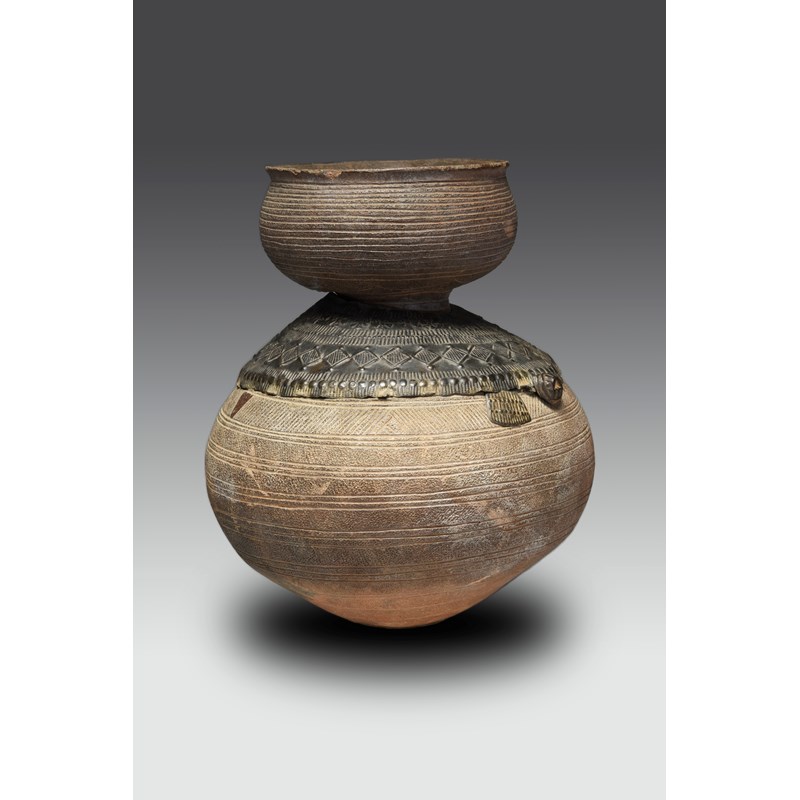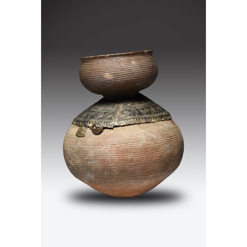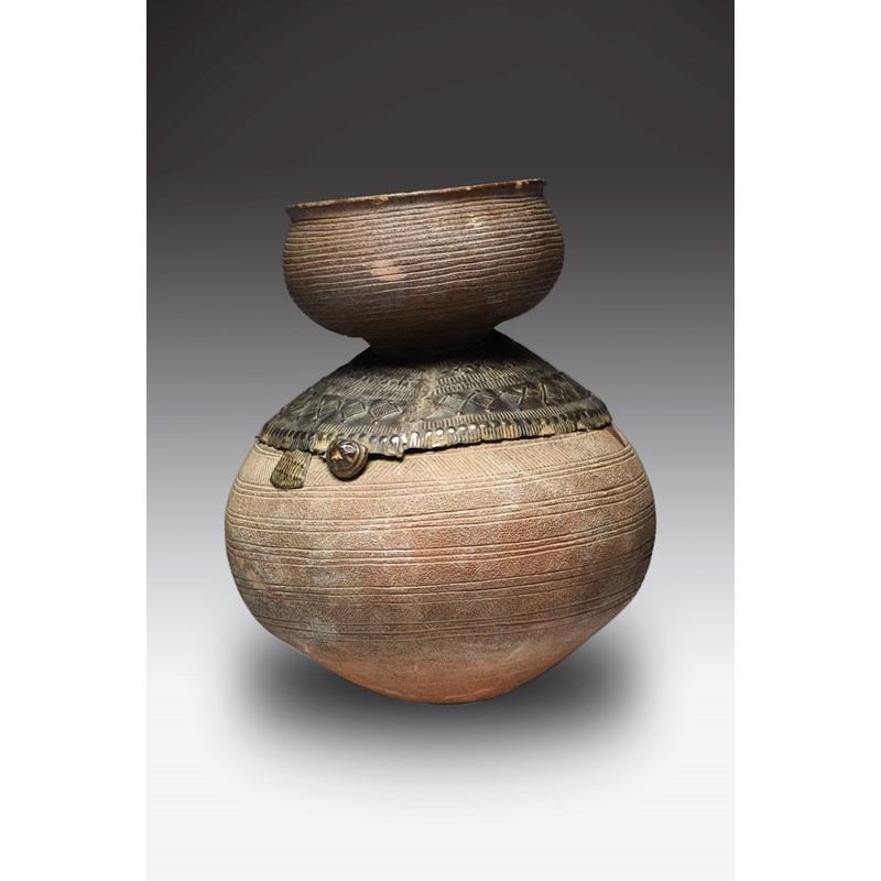 pottery, with incised linear decoration and an embossed sheet brass collar,
