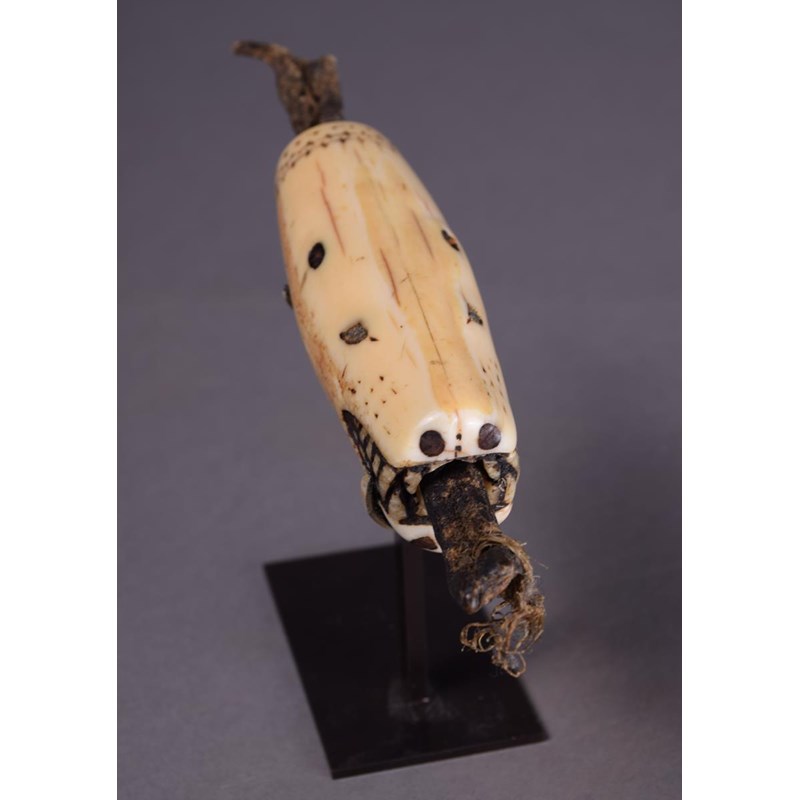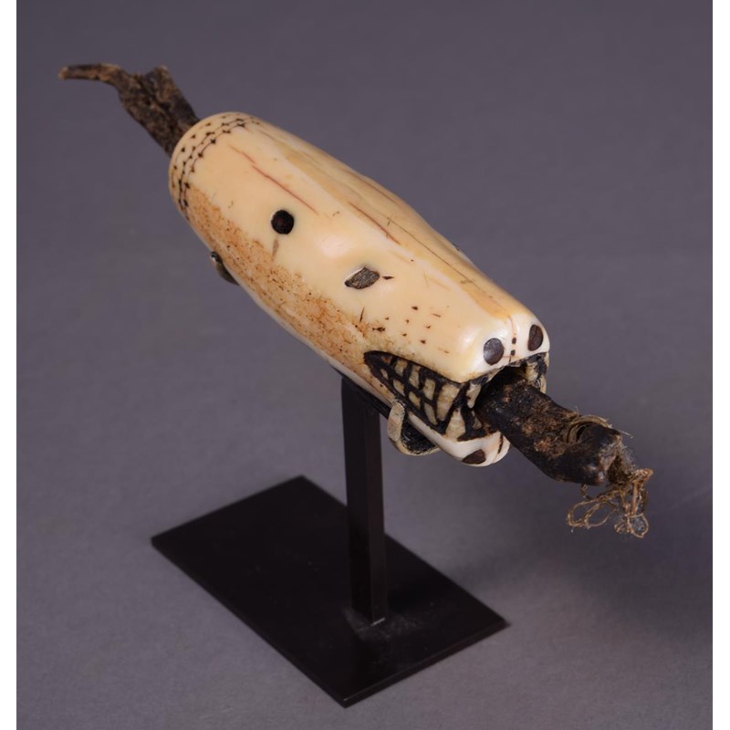 walrus ivory, baleen and seal skin cord, of cylindrical form and one end with opposing polar bear heads with inlaid nostrils and eyes, early 19th century,