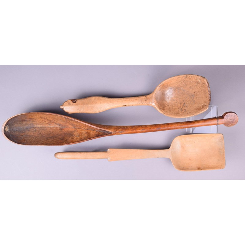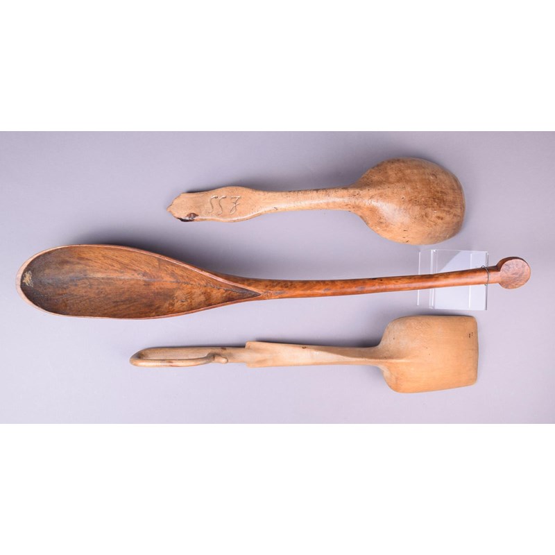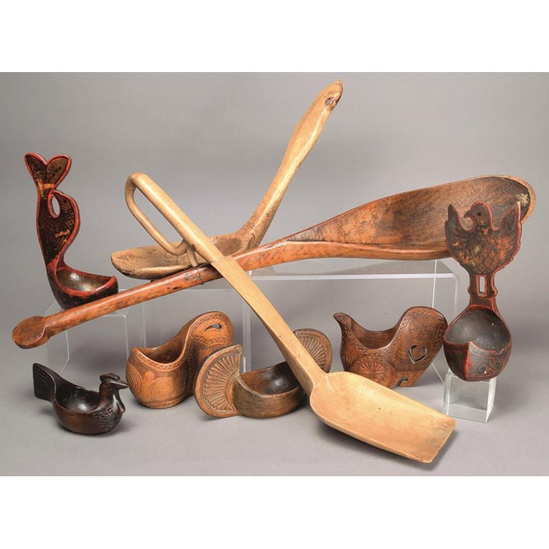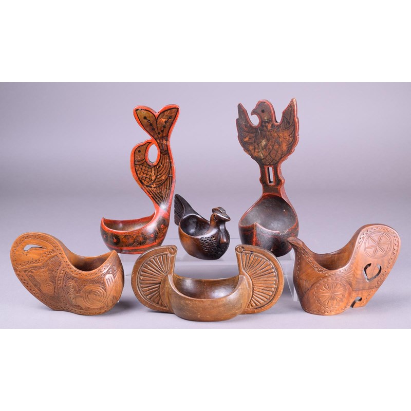 wood, including two lacquered with bird handles, two with chip carved decoration, one as a bird, one with two fan handles, a sycamore flat ladle, initialled LSS, one with a disc finial and one with an open grip,