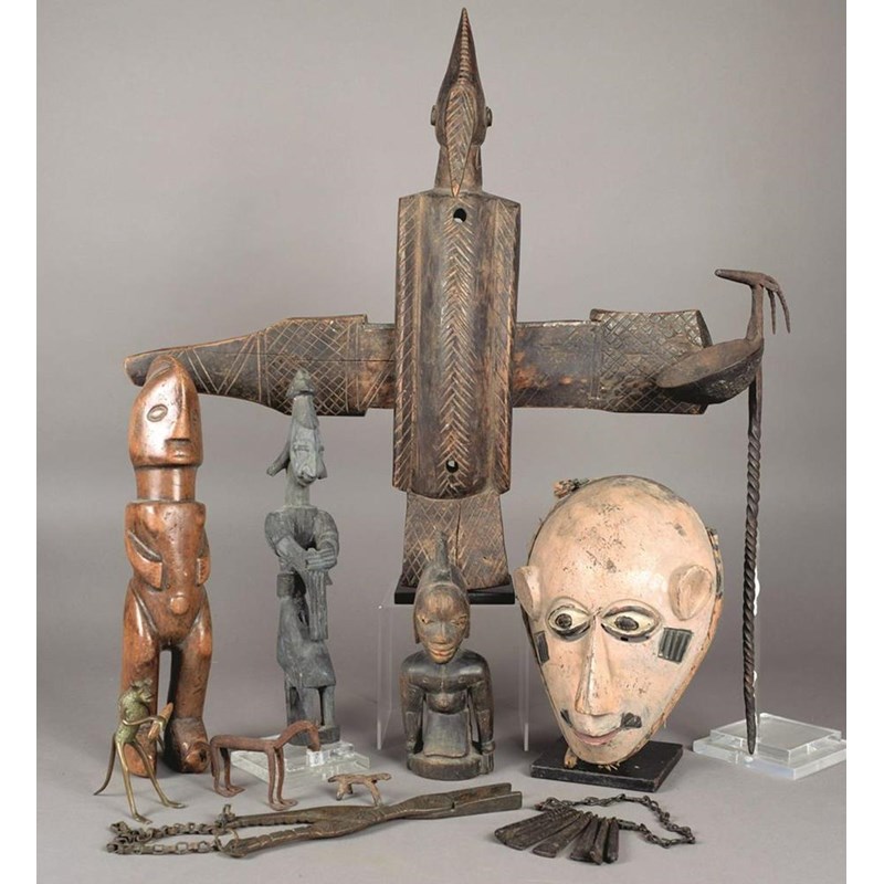 a Bambara door lock, two Yoruba figures, a standing figure, a Yoruba iron oil lamp, a Dogon horse and stylised animal, an iron Blacksmiths amulet, a pair of brass tongs and a Dohomey brass monkey. (12)